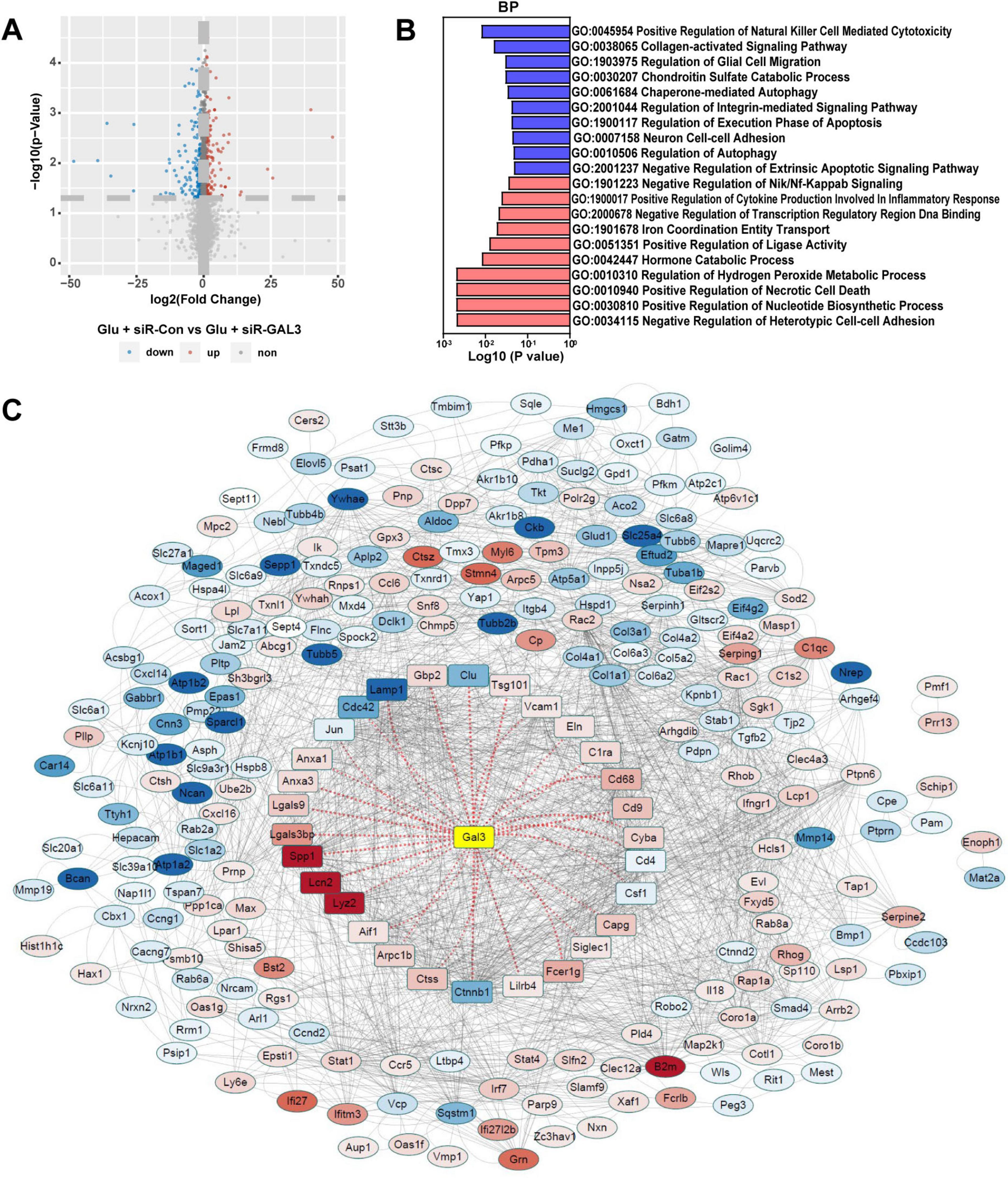 Figure 5. Sequencing analysis of spinal cord neurons with galectin-3 (GAL3) knocked down. (A) Volcano map shows differential expression genes (DEGs) in the neuron dataset. (B) Biological process (BP) analysis of Gene Set Enrichment Analysis (GSEA) in the neuron dataset. Each column represents the P-value score of the pathway between the Sham group and the spinal cord injury (SCI) group, with red indicating upregulation of the pathway in the SCI group, and blue indicating downregulation. (C) The Protein-Protein Interaction Networks (PPI) analysis of DEGs in the neuron dataset. In the PPI nodes, red indicates that the expression level increases and blue indicates that the expression level decreases. The darker the color, the greater the differential expression multiple.