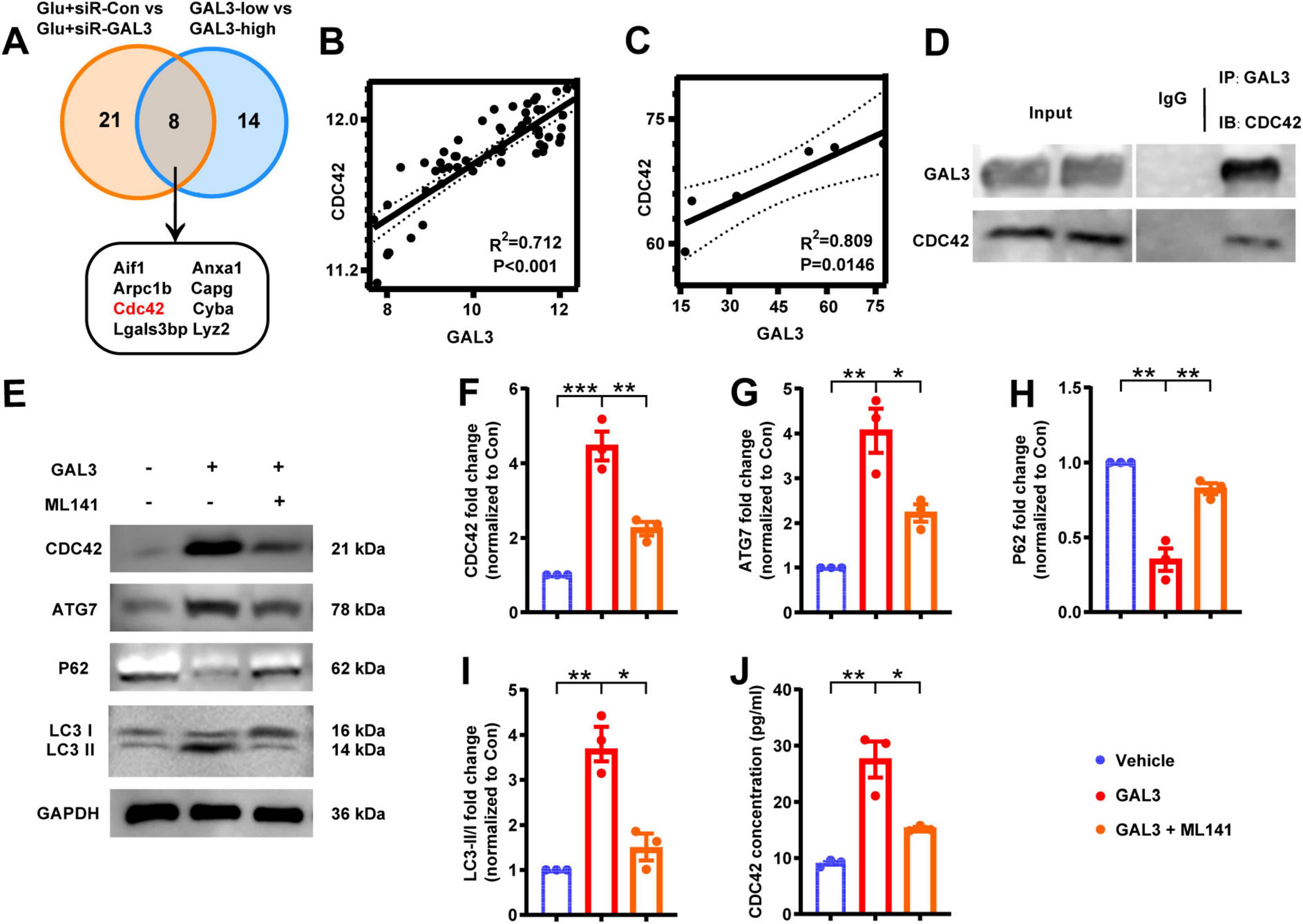 Figure 6. Galectin-3 (GAL3) interacts with Cell-division-cycle-42 (CDC42) to regulate neuronal autophagy. (A) Intersected 29 core nodes from the neuron dataset with 22 core nodes from the spinal cord injury (SCI) dataset by the Venn diagram. (B) Correlation analysis between GAL3 and CDC42 expression level in SCI dataset. (C) Correlation analysis between GAL3 and CDC42 expression level in the neuron dataset. (D) Co-immunoprecipitation (Co-IP) shows a direct interaction between GAL3 and CDC42 in the glutamate-induced neuronal damage model. (E) Western blot shows the expression of CDC42, ATG7, P62, and LC3 II/I. (F–I) Quantification of western blot detection of CDC42 (F), ATG7 (G), P62 (H), and LC3 II/I (I). One-way ANOVA, n = 3/group. (J) Enzyme-linked immunosorbent assay (ELISA) detection of CDC42 in cell supernatant of GAL3-injury model. Unpaired Student’s t-test, n = 3/group. *P < 0.05, **P < 0.01, ***P < 0.001.