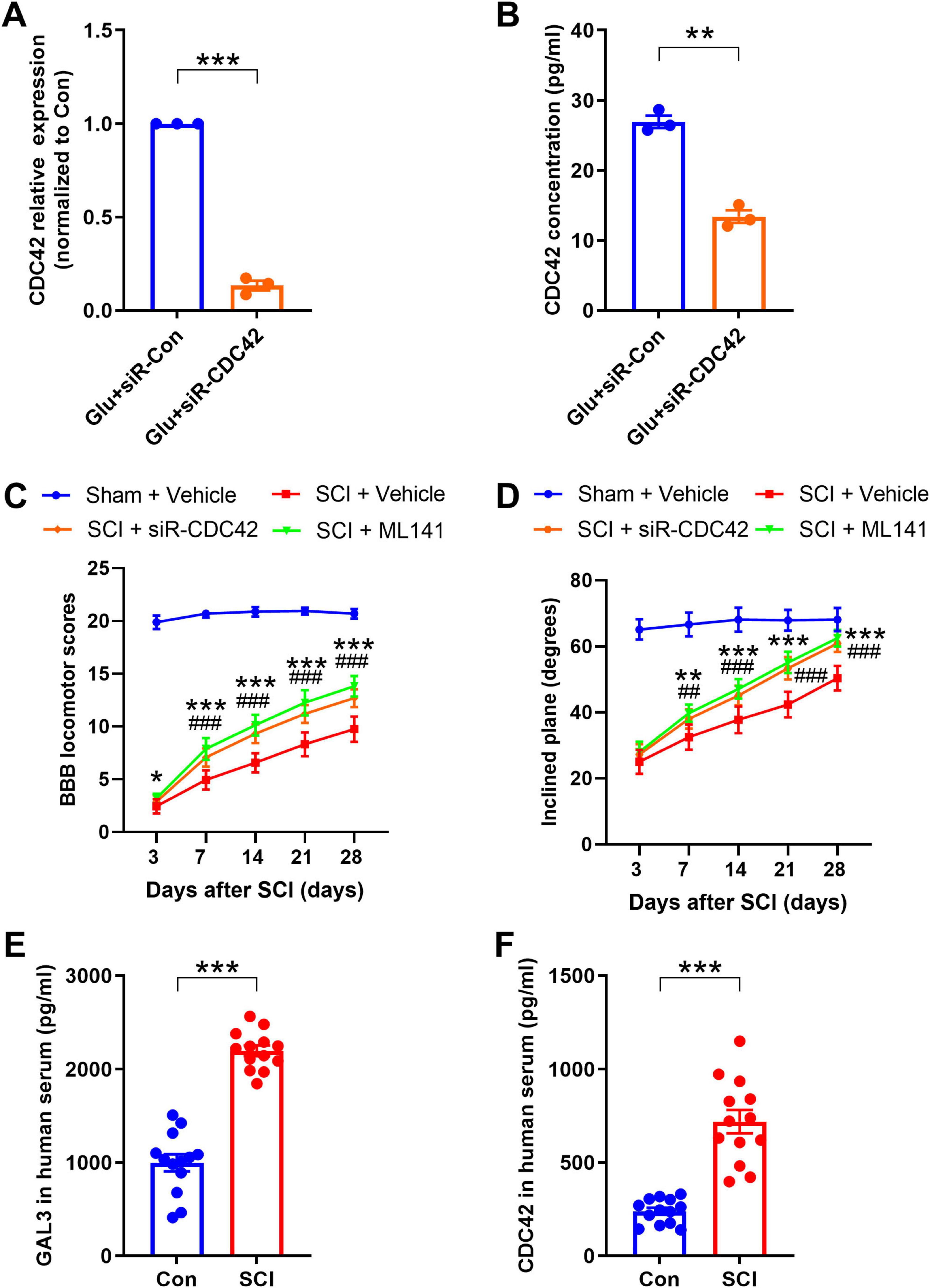Figure 8. Cell-division-cycle-42 (CDC42) contributes to spinal cord injury (SCI)-induced motor function impairment. (A) The mRNA level after siR-CDC42 treatment. Unpaired Student’s t-test, n = 3/group. (B) Enzyme-linked immunosorbent assay (ELISA) shows the secretory CDC42 in the supernatant of neurons after siRNA treatment. Unpaired Student’s t-test, n = 3/group. (C) The Basso-Beattie-Bresnahan (BBB) locomotor scores were increased after siR-CDC42 and ML141 treatment. Two-way Repeated Measures ANOVA, n = 8/group. (D) The inclined plane angles were increased after siR-CDC42 and ML141 treatment. Two-way Repeated Measures ANOVA, n = 8/group. When SCI + siR-CDC42 group was compared with SCI + Vehicle group, *P < 0.05, **P < 0.01, ***P < 0.001; when SCI + ML141 group was compared with SCI + Vehicle group, ##P < 0.01, ###P < 0.001. (E,F) Detection of the protein expression level of galectin-3 (GAL3) (E) and CDC42 (F) in serum of healthy volunteers and SCI patients by ELISA. Unpaired Student’s t-test, n = 8/group. ***P < 0.001.
