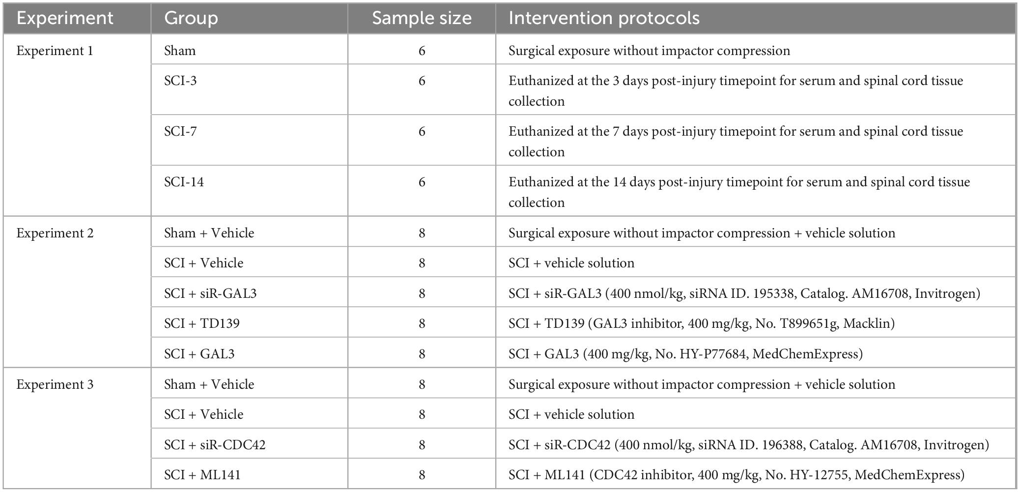 Prior to any surgical procedures that could potentially cause pain or discomfort, animals were administered appropriate anesthesia or analgesia. Following best practices recommended for the species and the nature of the surgery, the SCI model was established in rats through the intraperitoneal administration of avertin (Kuhn and Wrathall, 1998) (2,2,2-tribromoethanol, Sigma-Aldrich, 250 mg/kg) to induce anesthesia. Subsequently, a Walsh impactor weighing 35 g was used to apply compression at the T7–T9 level for 1 min. The successful induction of SCI was confirmed by the observation of hind limb flaccid paralysis. Serum and spinal cord samples were collected on the 3rd, 7th, and 14th day post-SCI. Each group, namely the sole SCI group and the Sham group, consisted of 6 rats.