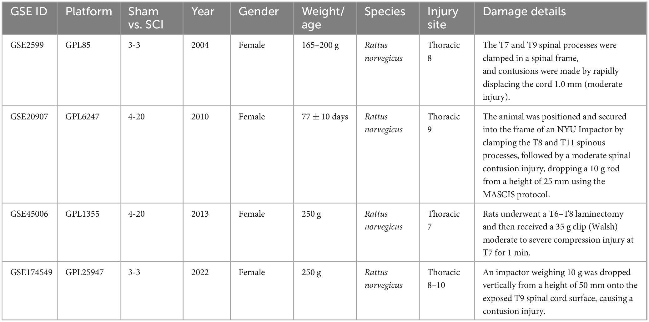 We downloaded the datasets of GSE2599 (Aimone et al., 2004), GSE20907 (Siebert et al., 2010), GSE45006 (Chamankhah et al., 2013), and GSE174549 (Li E. et al., 2022) from the Gene Expression Omnibus Datasets (GEO) available at https://www.ncbi.nlm.nih.gov/geo/. Table 2 displays the basic information for these four datasets. The 60 samples were re-divided into two groups based on the relative expression level of GAL3, and the role of GAL3 in SCI was investigated by single-gene analysis. Before dataset analysis, batch effects were removed, and standardization pretreatment was conducted. The R software (v4.3.01) was used to analyze and visualize data. The r package used to remove the batch effect is sva (Ge et al., 2011) (v3.46.02). After obtaining the expression matrix, limma package (Ritchie et al., 2015) (v3.54.23) was used for differential expression analysis. The screening criteria of differential expression genes (DEGs) are |logFC| > 1 and P-value < 0.05. We used Gene Set Enrichment Analysis (GSEA) (Han et al., 2019) as a calculation method to determine whether a set of a priori-defined genes show statistically significant consistent differences between two biological states by clusterProfiler (Wu et al., 2021) (v4.0.54). We used ggplot2 (Ito and Murphy, 2013) (v3.4.15) to screen out the candidate genes and used the STRING6 website and the Cytoscape software (v3.10.07) to analyze the candidate genes by Protein-Protein Interaction Networks (PPI)47.