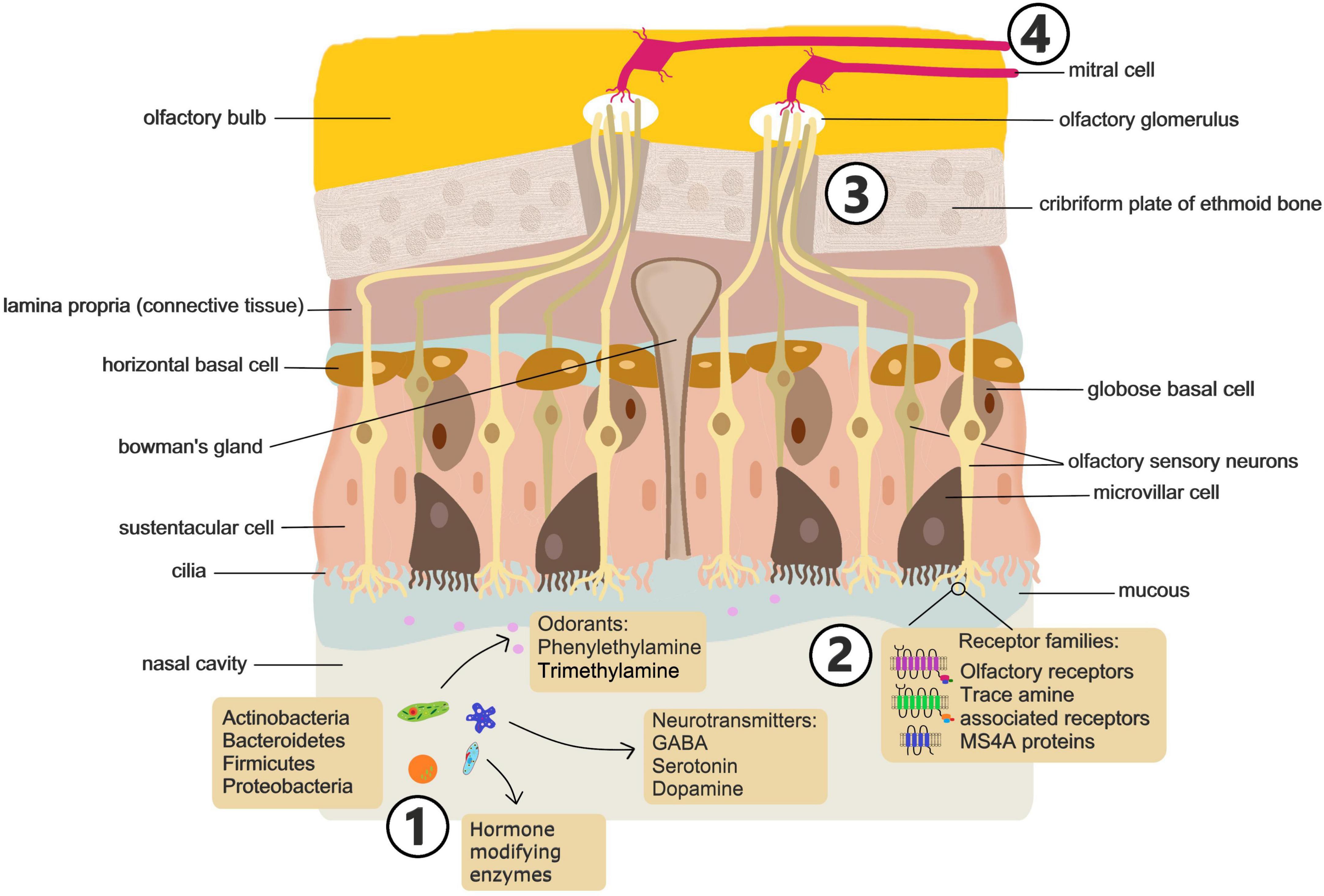 In keeping with organism-specific effects on OSN development, there is also good evidence that composition of the microbiota influences olfactory function. Different olfactory preferences develop in germ-free mice colonized with distinct microbiota profiles (Naudon et al., 2020). Olfactory epithelium properties, including electrophysiological responses and expression of genes associated with the olfactory transduction cascade also show several microbiota profile specific differences (Naudon et al., 2020). In humans, a study by Koskinen et al. (2018) indicated that subjects with lower olfactory function had a more diverse nasal microbiome compared to those with normal function. Evidence also suggested butyrate-producing Faecalibacterium and Porphyromonas species may be involved in reduced odor perception and discrimination (Koskinen et al., 2018).
