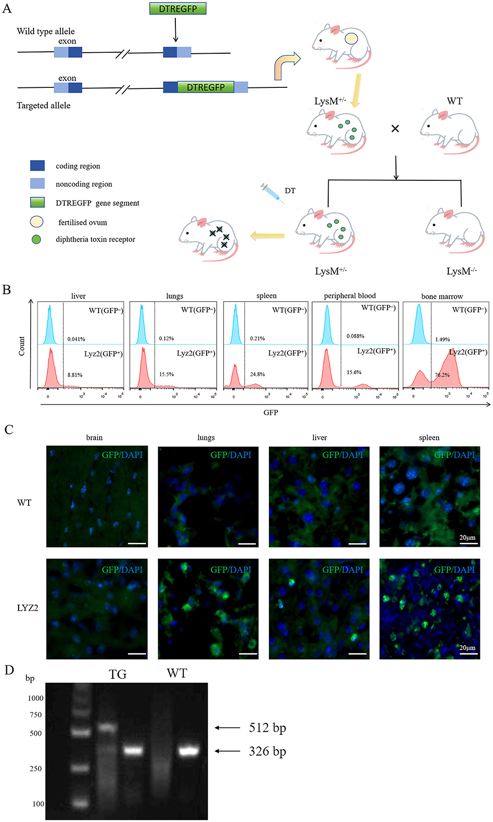 Figure 1. Characterization and genotypic validation of Lyz2-IRES-DTREGFP mice. (A): Schematic of the Lyz2-IRES-DTREGFP transgenic construct design. (B): Flow cytometry histogram showing GFP+ cell distribution in liver, spleen, lung, peripheral blood, and bone marrow of Lyz2-IRES-DTREGFP mice versus wild-type (WT) controls. GFP+ cells were predominantly detected in peripheral blood, bone marrow, and spleen, with minimal expression in lung and liver. (C): Immunofluorescence staining of GFP+ cells (green) in spleen, lung, and liver tissues. No GFP+ cells were observed in brain sections. Nuclei were counterstained with DAPI (blue). (D): Genotyping results via PCR and agarose gel electrophoresis. Transgenic mice (TG) exhibited dual DNA fragments (512 bp and 326 bp), while WT mice (WT) showed only the 326 bp fragment.