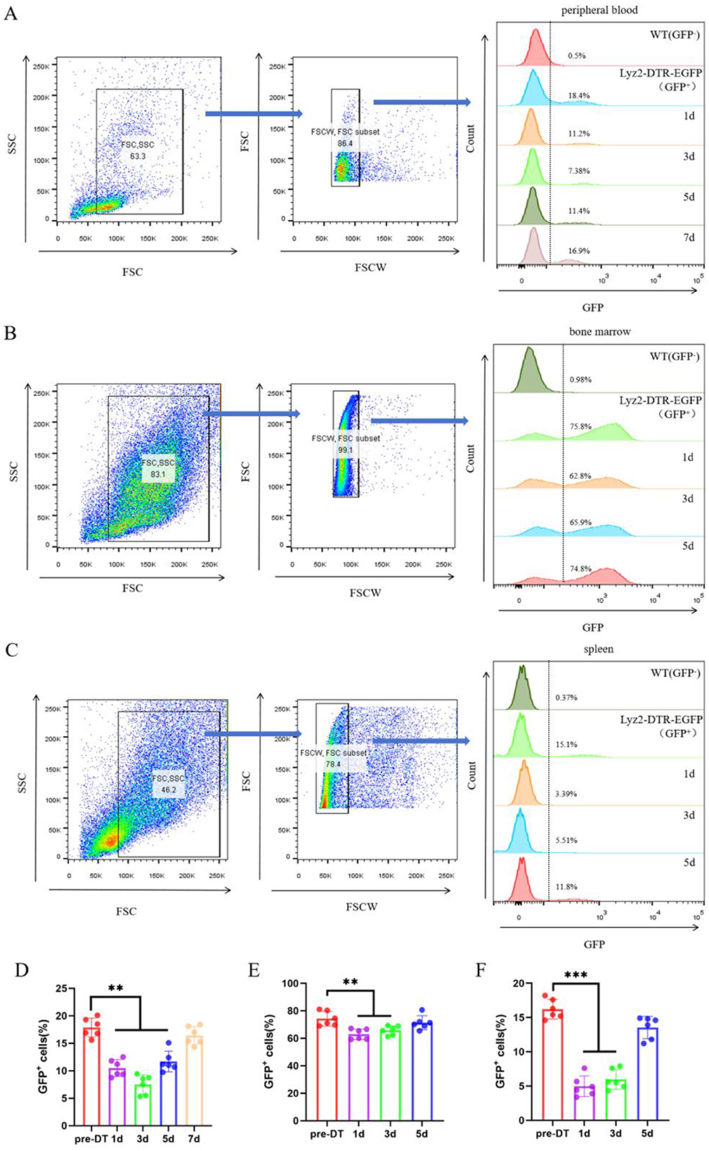 Figure 2. DT-Mediated Ablation of GFP+ Myeloid Cells in Lyz2-IRES-DTREGFP Mice. (A–C) Pseudocolor flow cytometry plots illustrate the ablation of GFP-positive myeloid populations in peripheral blood, bone marrow, and spleen following a 3-day course of diphtheria toxin (DT; 25 ng/g daily). The depletion kinetics show that GFP+ cells in peripheral blood reached their lowest level on day 3, while those in bone marrow and spleen were maximally depleted on day 1. Partial recovery was evident by day 5 (blood) and day 3 (bone marrow/spleen). Wild-type (WT) mice were used as negative controls. (D–F) Quantitative analysis of the time course of GFP+ cell depletion in peripheral blood (D), bone marrow (E), and spleen (F). Data are represented as mean ± SEM (n = 6). *P < 0.05, **P < 0.01, ***P < 0.001 vs. baseline (pre-DT).