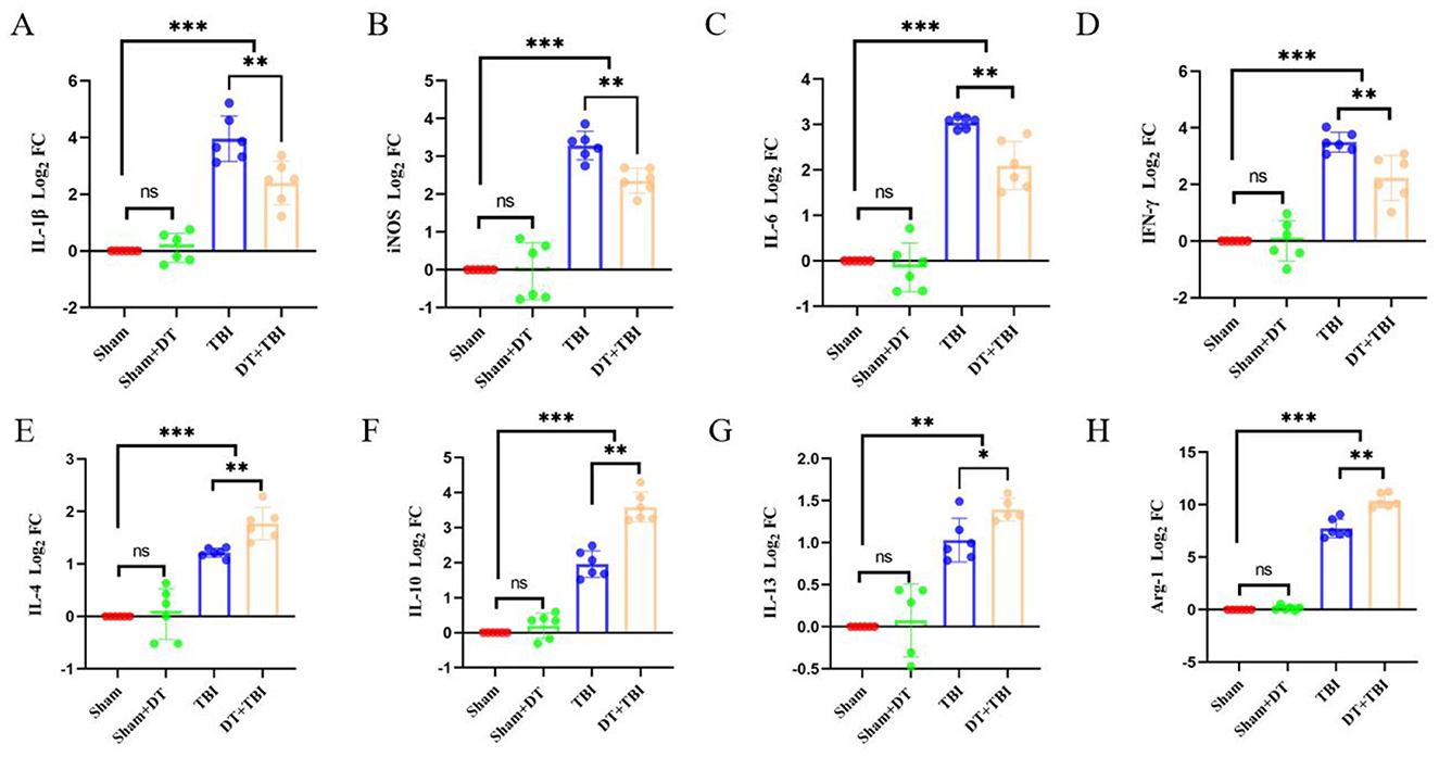 Figure 3. Myeloid depletion attenuates pro-inflammatory signaling and enhances anti-inflammatory mediators post-CCI. A-H: RT-qPCR analysis of pro-inflammatory (IL-1β, iNOS, IL-6, IFN-γ) and anti-inflammatory (IL-4, IL-10, IL-13, Arg-1) cytokine Log2 FC value in brain tissue 3 days post-CCI, normalized to GAPDH. Sham (uninjured controls), TBI (CCI alone), and DT+TBI (CCI with myeloid depletion) groups were compared. DT+TBI mice exhibited reduced pro-inflammatory (A–D) and elevated anti-inflammatory (E–H) cytokine expression versus TBI mice. Data are mean ± SD (n = 6); *P < 0.05, **P < 0.01, ***P < 0.001 (DT+TBI vs. TBI).