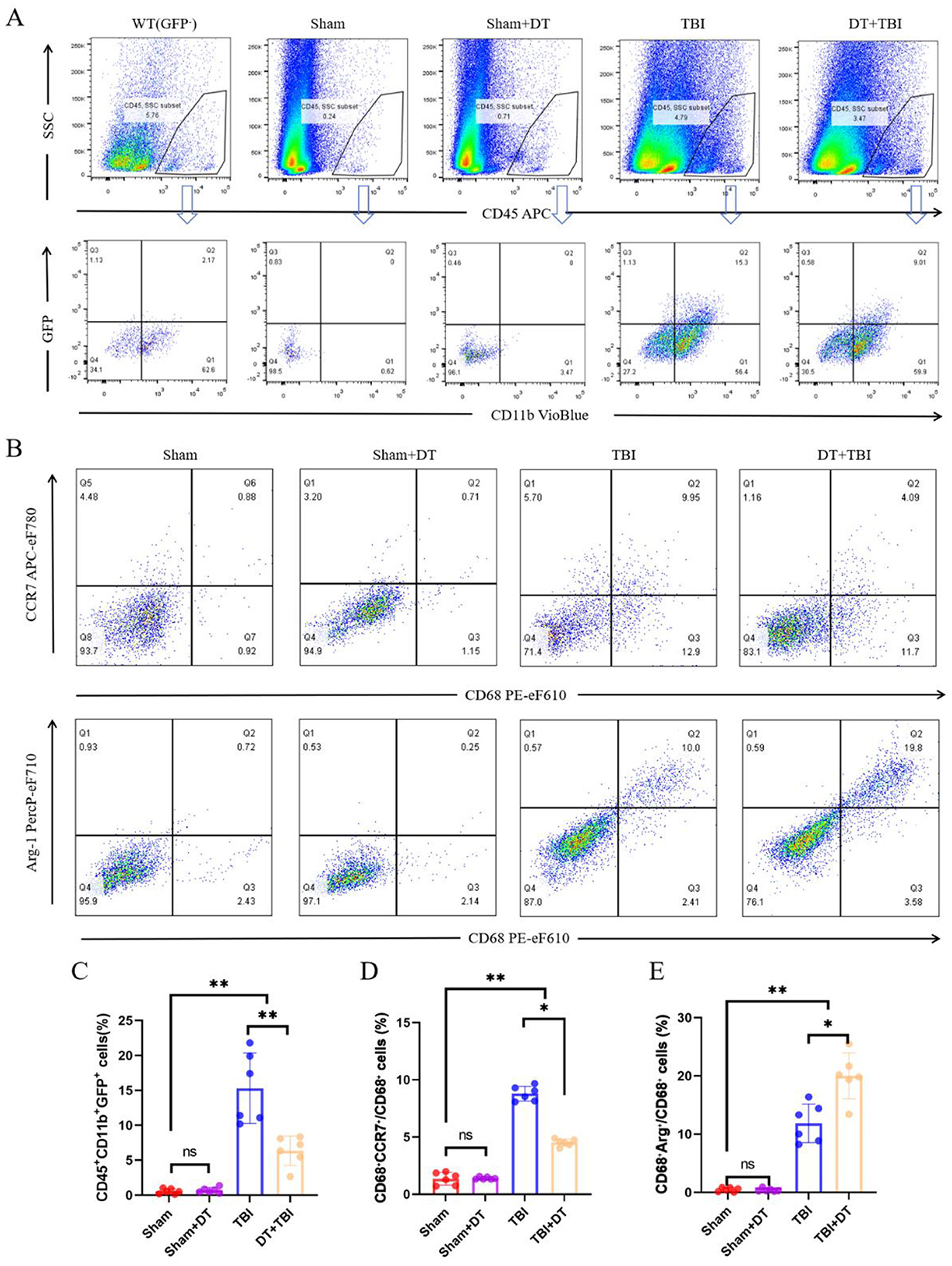 Figure 4. Myeloid depletion shifts pro/anti-inflammatory macrophage polarization dynamics post-CCI. (A): Flow cytometry gating strategy: CD45+ cells were initially selected, followed by identification of CD11b+GFP+ myeloid cells. Wild-type (WT) mice served as negative controls. (B): Representative flow cytometry pseudocolor plots of pro-inflammatory (CD68+CCR7+) and anti-inflammatory (CD68+Arg-1+) macrophage subsets. (C): Quantification of CD45+CD11b+GFP+ cell proportions across groups (Sham, Sham+DT, TBI, DT+TBI). DT+TBI mice exhibited significant depletion versus TBI and Sham groups (n = 6; **P < 0.01). D-E: Proportions of pro-inflammatory (D) and anti-inflammatory (E) cells in total CD68+ polarized macrophages. DT + TBI mice showed reduced pro-inflammatory and increased anti-inflammatory polarization versus TBI mice (n = 6; *P < 0.05). Data are mean ± SEM.