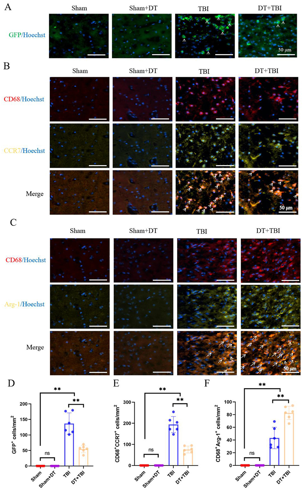 Figure 5. IHF validation of myeloid depletion effects on pro/anti-inflammatory polarization post-CCI. (A): Representative IHF images of GFP+ myeloid cells (green) in brain sections. GFP+ cells were absent in Sham and Sham + DT groups but detected in TBI and DT+TBI groups, with significant reduction in DT+TBI versus TBI (n = 6; **P < 0.01). Nuclei were counterstained with Hoechst (blue). (B,C): Representative multiplex IHF images of pro-inflammatory (B) and anti-inflammatory (C) macrophage markers in the peri-lesion area. To enhance specificity and clarity, the fluorophore for CCR7 and Arg-1 was changed from purple to yellow. Macrophages are identified by CD68 (red). Pro-inflammatory macrophages are defined as CD68+CCR7+ cells (orange, indicated by arrows). Anti-inflammatory macrophages are defined as CD68+Arg-1+ cells (orange, indicated by arrows). Note the minimal presence of positive cells in Sham and Sham + DT groups. (D–F): Quantification of GFP+ cells (D), pro-inflammatory (E), and anti-inflammatory (F) macrophage proportions. DT + TBI mice exhibited reduced pro-inflammatory and increased anti-inflammatory polarization versus TBI (n = 6; **P < 0.01). Data are mean ± SEM; *P < 0.05, **P < 0.01 (DT + TBI vs. TBI).