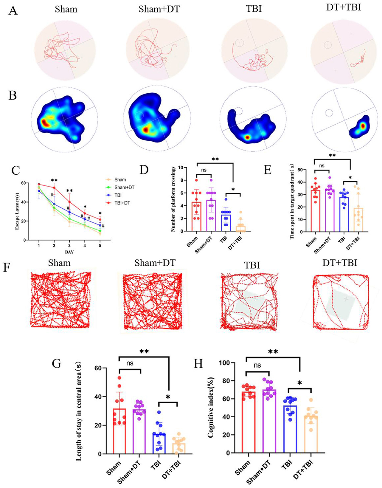 Figure 6. Myeloid depletion exacerbates chronic behavioral and cognitive deficits in CCI mice. (A): Representative swimming trajectories in the Morris water maze during the probe trial (days 23–28 post-CCI). (B): Heatmap depicting spatial preference for the target quadrant. (C–E): Quantification of escape latency (*P < 0.05 compared with the TBI group, #P < 0.05 compared with the sham group) (C), platform crossings (D), and time spent in the target quadrant (E). DT+TBI mice exhibited prolonged latency, fewer crossings, and reduced target quadrant time versus TBI and Sham groups (n = 6; *P < 0.05). (F): Representative movement trajectories in the open field test (day 21 post-CCI). (G): Time spent in the center zone during the open field test. DT + TBI mice showed reduced center exploration versus TBI and Sham groups (*P < 0.05). (H): Statistical graph of the cognitive index. (n = 6, *P < 0.05, **P < 0.01).