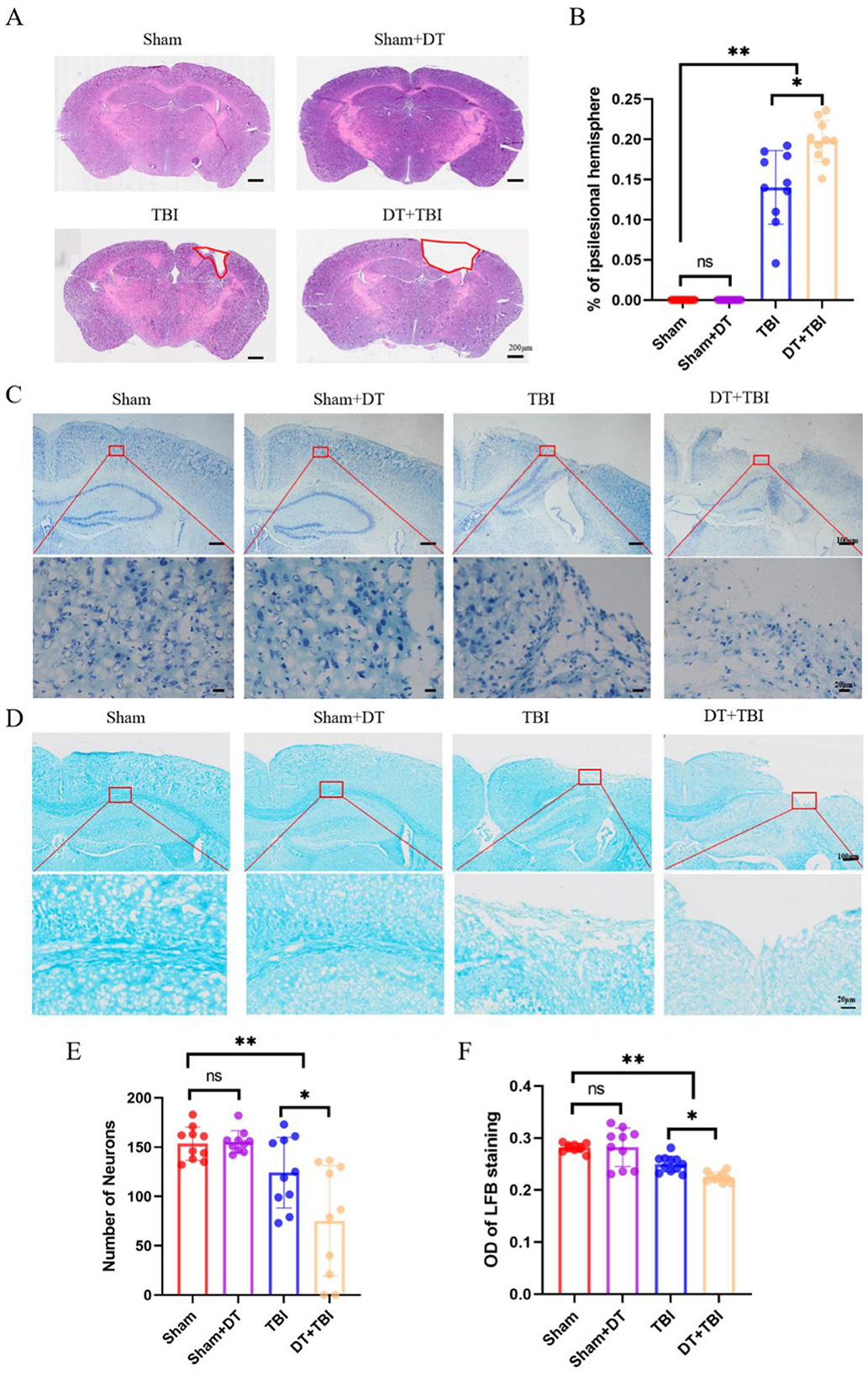 The mice were anesthetized with a cocktail of ketamine (80 mg/kg)/xylazine (10 mg/kg) intraperitoneally injection. A mouse brain stereotaxic apparatus (Reward, China) was used to precisely locate the hippocampal region (AP: −1.7 mm, ML: −1.2 mm, DV: −2.0 mm). After localization, a circular craniotomy was performed on the skull surface using a drill. The mice were then positioned on a PSI-IH impactor (PSI, USA), and an impact force of 100 kDynes was delivered to induce a moderate brain contusion. Successful modeling was confirmed by the appearance of a red impact site on the cerebral surface that gradually expanded and was accompanied by slight hemorrhaging. Both male and female mice were included and randomly assigned to four groups: (1) the Sham group, which underwent craniotomy without contusion injury; (2) the Sham+DT group, which received DT injections for three consecutive days prior to the experiment, with other procedures identical to the Sham group; (3) the TBI group, which underwent contusion injury; and (4) the DT+TBI group, which received DT injections for three consecutive days prior to the experiment followed by contusion injury.