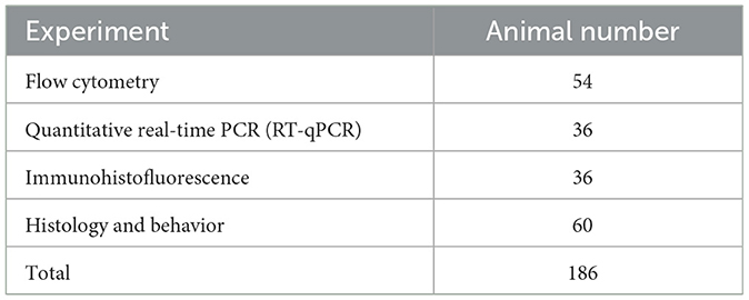 A total of 186 specific pathogen-free (SPF) grade, healthy adult Lyz2-IRES-DTREGFP female mice (aged 8 weeks, weighing 20-23 g) were used in this study (Table 1). The mice were obtained from Shanghai Southern Model Biotechnology Co., Ltd., with the animal license number SCXK (Shanghai) 2017-0010. Every experimental process and animal care was carried out strictly in accordance with the regulations set forth by China's Ministry of Science and Technology. All experimental groups were sent by random number table.