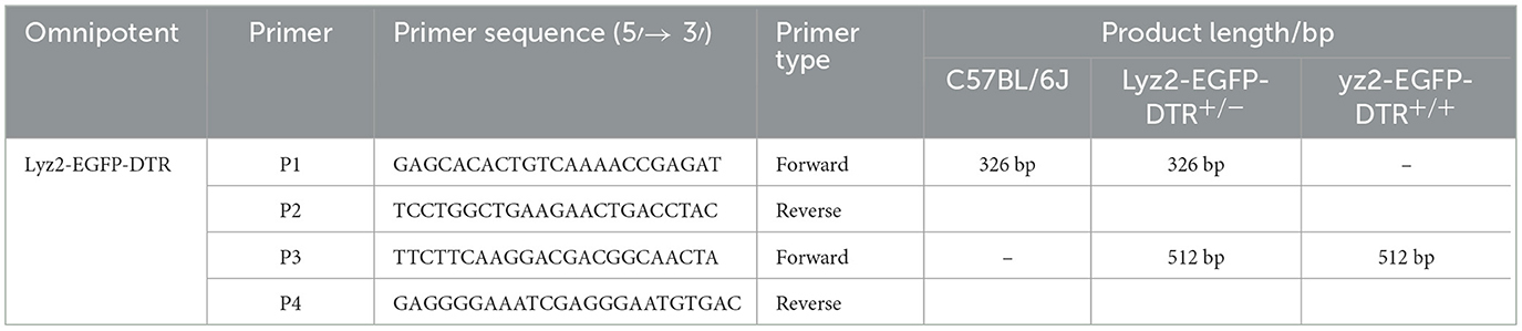 Mouse toe tissue was collected and placed in a 1.5 mL nuclease-free microcentrifuge tube. Then, 200 μL of protease lysis buffer (containing Proteinase K and 1 × Mouse Tissue Lysis Buffer; TIANGEN, Beijing, China) was added. After complete lysis, the upper aqueous phase containing RNA was collected for reverse transcription. The resulting cDNA was diluted with DEPC-treated water to a concentration ranging from 1 to 10 ng/μL. The PCR reaction mixture was prepared on ice according to the manufacturer's instructions, using the following cycling conditions: initial denaturation at 94 °C for 5 minutes; 35 cycles of denaturation at 94 °C for 30 seconds, annealing at 55 °C for 30 seconds, and extension at 72 °C for 30 seconds; followed by a final extension at 72 °C for 7 minutes. The primer sequences used in this study are listed in Table 2.