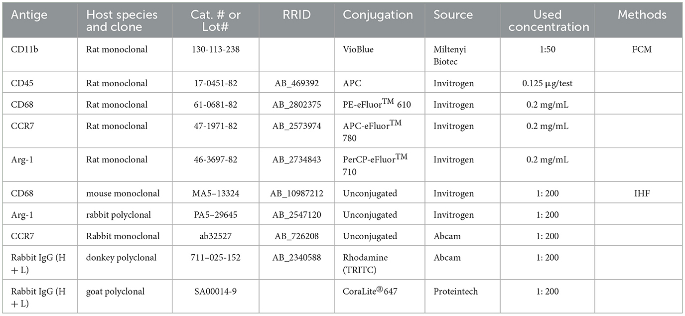 The mice were anesthetized as above. A volume of 50 μL of blood was collected from the mouse tail vein and mixed with 1 mL of erythrocyte lysis buffer (ThermoFisher, USA). Following two rounds of washing with phosphate-buffered saline (PBS; Biosharp, China), the sample was preserved by fixing it with 2% paraformaldehyde (PFA; Biosharp, China). Following PBS perfusion, the liver, lung, spleen, bone marrow, and brain were harvested from the mice. Tissues were prepared in accordance with the guidelines provided by the manufacturer. (Reward, China). After being homogenized and centrifuged, the liver, lung, and spleen were twice cleaned with PBS and preserved with 2% PFA. A syringe was used to clean away bone marrow cells after the femur was removed and both ends were severed. After two PBS washes, the cells were fixed with 2% PFA. Brain tissue was homogenized and centrifuged, followed by fixation, permeabilization, and incubation with antibodies at 4 °C for 30 minutes. After washing with PBS to remove unbound antibodies, the samples were fixed with 2% PFA. The antibodies used in this study are listed in Table 3.