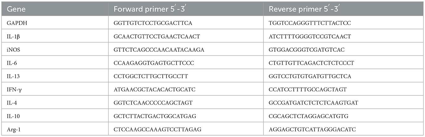 Three days post-CCI, mice were anesthetized as above and perfused with 15 mL of phosphate-buffered saline (PBS; Biosharp, China) via cardiac injection. After perfusion, the skull was opened, and the region of interest, which was around 2 mm of tissue surrounding the damage site, was put in an EP tube devoid of enzymes. Trizol reagent (Ambion, USA) was used to extract total RNA from the tissue, and a commercial kit was then used to reverse-transcribe the RNA into cDNA. Taq SYBR® Green qPCR Premix (Best Enzymes, Jiangsu Bestime, China) was used for quantitative real-time PCR (qPCR) on a QuantStudioTM 3 PCR Detection System (Applied Biosystems, CA, USA). Relative gene expression levels were calculated using the Log2 FC method (Taylor et al., 2019; Bustin et al., 2009; Livak, 2001). To determine the relative expression of the genes in each group, the Sham groups were normalized. Table 4 lists the primer sequences utilized in this investigation.