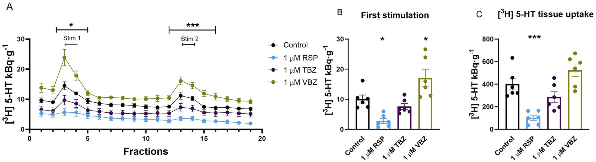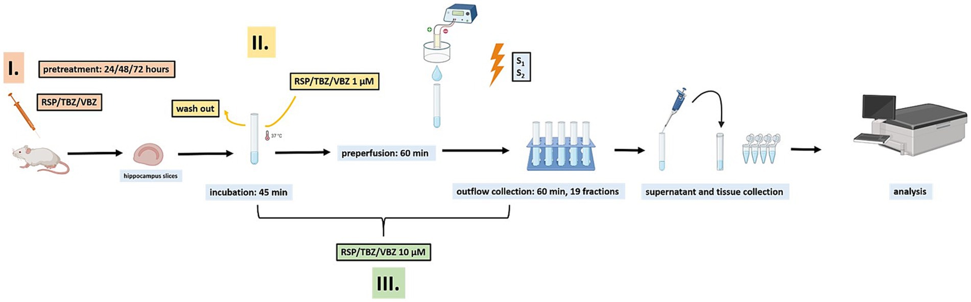 Mice were sacrificed in a 2-step manner according to the American Veterinary Medical Association guidelines for the Euthanasia of Animals. First, the animals were anaesthetized with a relatively high dose of isoflurane for rapid loss of consciousness (>1.5 v/v %) in a sufficiently large container to prevent hypoxia. Then, mice were decapitated, and the brain was immediately removed and placed into ice-cold Krebs solution [composition (in mM): 113 NaCl, 4.7 KCl, 1.2 MgSO4, 2.5 CaCl2, 25 NaHCO3, 1.2 KH2PO4, 115 glucose, 0.3 Na2EDTA, and 0.03 ascorbic acid]. After removal, the hippocampus was isolated and sliced into 400 μm thick slices (Milusheva et al., 1994) using a tissue chopper and incubated for 45 min in 1 mL of Krebs buffer (see above) containing radioactive [3H] NA or [3H] 5-HT (5 μCi·mmol−1). After this incubation period, the incubation medium was replaced, allowing complete washout of any residual volatile anesthetic. Although we did not directly measure the residual isoflurane concentration, similar incubation and washout protocols have been applied in our previous studies (Csölle et al., 2013; Tod et al., 2024; Gölöncsér et al., 2024), where animals were anesthetized using the same procedure and no confounding effects on neurotransmitter uptake or release were observed. Therefore, it is unlikely that isoflurane exposure affected the present results. Possible residual effects of isoflurane anesthesia were controlled by the incubation and washout procedures described in the Discussion (see Discussion, Limitations, Methodological considerations). Experiments were conducted at 37 °C in a modified Krebs solution, continuously saturated with carbogen gas (95% O2 and 5% CO2). To investigate the effects of RSP, TBZ, and VBZ, three different treatment protocols were applied (Figure 1). (i) In some experiments, mice received intraperitoneal injections of the corresponding drug (RSP 1 mg·kg−1, TBZ 2.5 mg·kg−1, VBZ 2.5 mg·kg−1) 24, 48, or 72 h before hippocampal slices were prepared for release measurements (Figures 4, 5, 8). (ii) In other experiments, the drugs were added only during a 45-min incubation period in 1 mL Krebs solution, after which they were washed out and were no longer present during the measurement (Figure 7). (iii) In a third set of experiments, the drugs were continuously present in the Krebs perfusate until the end of the measurement (Figures 2, 3, 6). Following the incubation, the preparations were washed three times with 10 mL of ice-cold, oxygenated Krebs solution, and three to four slices were transferred to a thermoregulated four-channel (internal volume, 100 μL) microperfusion system (Hennings et al., 1999) and maintained at 37 °C. The release experiments were performed as previously described (Milusheva et al., 2008); the preparation was superfused with Krebs solution at a rate of 0.5 mL·min−1 for 60 min before each measurement. After 60 min of preperfusion, the outflow was collected in 1.5 mL·min−1 fractions (3 min each) for 60 min (19 fractions). During the third (S1) and 13th (S2) collection periods, the preparations were field-stimulated electrically with the following parameters: [3H] NA: 20 V, 2 Hz, with a 2 ms impulse duration for 1 min (120 pulses) and [3H] 5-HT: 40 V, 2 Hz, with a 2 ms impulse duration for 1 min (120 pulses) using a Grass S88 stimulator. The vesicular release of radioactivity evoked by electric field stimulation was sensitive to tetrodotoxin, which was applied at a concentration of 1 μM. The supernatant (500 μL) from each fraction was added to 2 mL of scintillation mixture (Ultima Gold; Packard, Canberra, Australia). At the end of the perfusion period, the tissue was removed from the chamber and the residual radioactively labeled neurotransmitters were extracted with 5 mL of 10% trichloroacetic acid for 30 min; 100 μL of the supernatant was added to 2 mL of scintillation mixture, and the radioactivity was measured using a Packard 1900 Tricarb and 5110 TR liquid scintillation counter (Packard). The samples’ radioactivity was expressed in disintegrations per gram of wet tissue weight (Becquerels per gram, Bq·g−1).