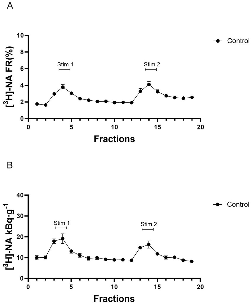 Figure 2. The release of [3H] noradrenaline ([3H] NA) in response to electric field stimulations expressed in fractional release (A) and Bq·g−1 (B). The tissue slices were stimulated at the third (Stim 1) and 13th (Stim 2) fractions. Curves show the means ± SEM of the identical experiments. n = 6 mice.