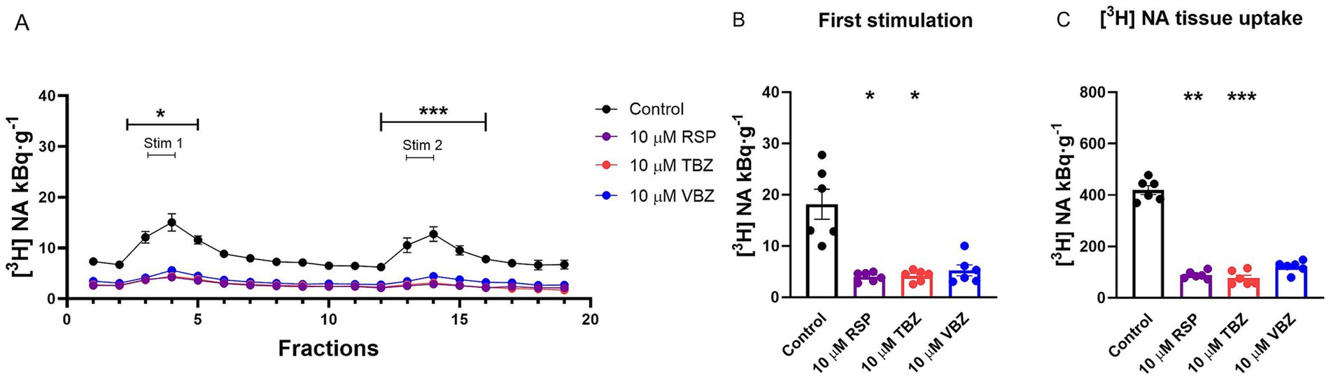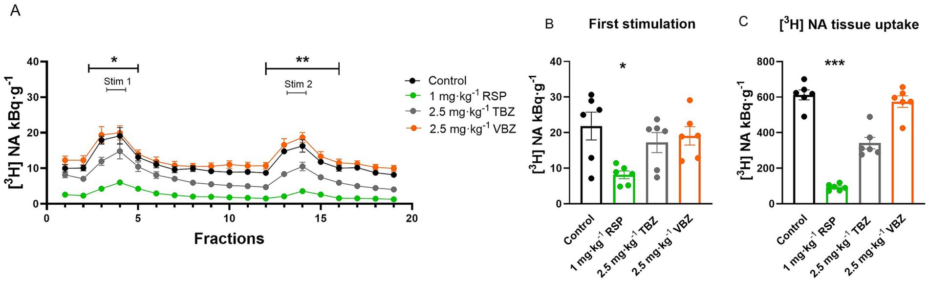 A potential methodological limitation concerns the possible residual effect of isoflurane used for anesthesia. In our experiments, isoflurane was applied only briefly (≥1.5 v/v%) to induce rapid loss of consciousness, followed immediately by decapitation. The brain was then immersed in ice-cold, oxygenated Krebs buffer, and hippocampal slices were washed three times before the uptake phase and superfused for 60 min prior to stimulation. During this period, the incubation and perfusion media were continuously replaced, allowing effective washout of any volatile anesthetic residues. Isoflurane is a volatile agent with a relatively low blood/gas partition coefficient (1.45 ± 0.12), enabling rapid equilibration and elimination from the brain (Esper et al., 2015). In vivo 19F-NMR studies have shown that isoflurane is cleared from the brain with a fast half-life of approximately 7–9 min, followed by a slower redistribution phase (Chen et al., 1992). Given these pharmacokinetic properties and our extended washing and perfusion protocol, any residual isoflurane in the slices is expected to be negligible. Moreover, all control and drug-treated groups underwent identical anesthesia and tissue preparation procedures; therefore, any group differences in stimulation-evoked transmitter release can be attributed to the pharmacological actions of RSP, TBZ or VBZ, rather than anesthetic carry-over. Consistent with this, stimulation-evoked [3H] monoamine release in control slices was robust, tetrodotoxin-sensitive, and within physiological ranges, arguing against tonic suppression of transmitter release by residual anesthetic. Nevertheless, a minor transient modulatory effect of isoflurane on monoaminergic transmission cannot be completely excluded and should be considered as a potential limitation.