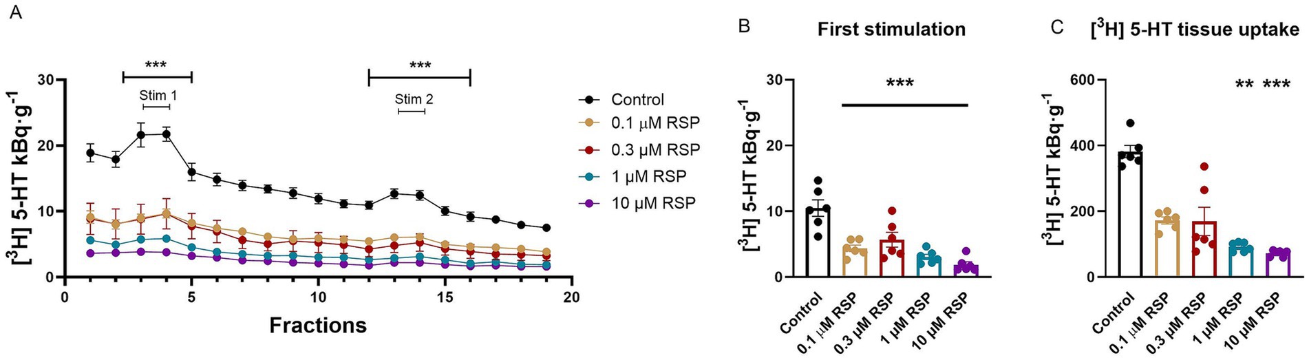 In further experiments, we studied the stimulation-evoked vesicular release of radioactivity from slices loaded with [3H] 5-HT in the presence of 0.1, 0.3, 1.0, and 10 μM RSP (Figure 6). All applied doses significantly reduced the electric field stimulation-evoked vesicular release in the hippocampus, compared with the control group at S1 and S2 (control: S1: 10.5 ± 1.2 kBq·g−1; S2: 4.5 ± 0.64 kBq·g−1; 0.1 μM: S1: 4.4 ± 0.5 kBq·g−1; p = 0.0002; S2: 1.9 ± 0.16 kBq·g−1: p = 0.0007; 10 μM: S1: 1.29 ± 0.24 kBq·g−1: p < 0.0001; S2: 0.83 ± 0.5 kBq·g−1: p < 0.0001) (Figures 6A,B). The S1 and S2-induced release of [3H] 5-HT was inhibited, indicating that the maximum vesicular axonal activity-induced release was reduced by 87.6%. The tissue’s [3H] 5-HT content was decreased in a concentration-dependent manner, as by loading the tissue at 1.0 μM concentration, the storage capacity was inhibited to 91.7 ± 5.84 kBq·g−1: p > 0.9999, respectively, and by loading the tissue at 10 μM concentration, the storage capacity was significantly altered by 72.4 ± 3.9 kBq·g−1: p < 0.0001, compared to the control group (381 ± 18.9 kBq·g−1) (Figure 6C).