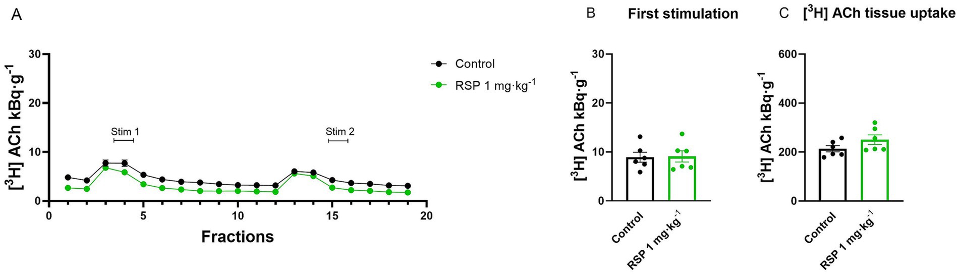 There is several evidence that the cholinergic system is also involved in the pathophysiology of depression through nAChR alpha7 activation (Pahlavani, 2024); therefore, we investigated the effect of RSP on the stimulation-evoked release of acetylcholine. For the detection of [3H] ACh release, hippocampal slices were obtained as described for [3H] NA. First, we conducted a 45-min-long incubation with [3H]-choline (5 μCi/mL) in a 1 mL organ bath containing 37 °C Krebs solution. At the end of the incubation period, the slices were washed five times with Krebs solution and transferred to the four-channel microperfusion system and superfused with Krebs solution at a rate of 0.5 mL/min for 60 min. To selectively prevent the [3H] choline reuptake, high-affinity choline transporter inhibitor hemicholinium-3 (10 μM) was added throughout the experiments, which did not affect ACh’s resting and axonal stimulation-induced release. After 60 min of preperfusion, nineteen 3-min samples were collected, and the tissues were stimulated twice, at the third fraction (S1) and the 13th fraction (S2). Supramaximal electrical train stimulation was performed using a Grass S88 stimulator, with the following parameters: 40 V, 2 Hz, 2 ms, 1 min. The total radioactivity released from the tissue and collected in the perfusion fluid was considered to represent the amount of vesicular [3H] ACh released following hydrolysis rather than that of [3H] choline released directly from nerve terminals (Milusheva et al., 1994). At the end of radioactivity collection, supernatant (500 μL) from each fraction was added to 2 mL of scintillation mixture (Ultima Gold; Packard). After sample collection, the tissues were removed from the chambers, and the residual [3H] ACh was extracted using 5 mL of 10% trichloroacetic acid for 30 min. Subsequently, 100 μL of supernatant was added to 2 mL of scintillation mixture; the radioactivity was determined using a liquid scintillation counter (Packard 1900 Tricarb and 5110 TR) and expressed in disintegrations per gram of wet tissue weight (Bq·g−1).