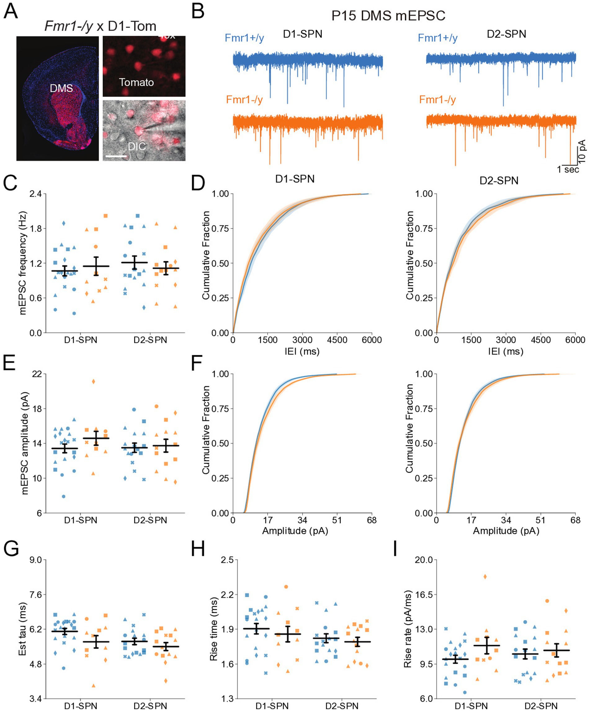 Figure 1. Normal synaptic transmission in D1- and D2-SPNs of the DMS in P14-P15 Fmr1−/y mice. (A) Schematic representing a coronal brain section and whole-cell recordings of D1-SPNs (labeled with D1-Tomato) and D2-SPNs (td-Tomato negative) in the DMS of P14-P15 Fmr1−/y and Fmr1+/y mice. (B) Representative AMPAR-mediated mEPSCs in D1-SPNs (left) and D2-SPNs (right) of Fmr1+/y (blue) and Fmr1−/y (orange) mice. n = 10, 11 D1- and D2-SPN from N = 6 Fmr1+/y mice; n = 12, 12 D1- and D2-SPN from N = 5 Fmr1−/y mice (C) Average mEPSC frequency. (D) Cumulative distribution of inter-event intervals (IEIs) of mEPSCs in D1- and D2-SPNs (left and right, respectively). (E) Average mEPSC amplitude. (F) Cumulative distribution of mEPSC amplitudes in D1- and D2-SPNs (left and right respectively). (G) Average mEPSC decay tau, (H) rise time and (I) rise rate. Plots show individual data points, with shape representing a mouse within the group (i.e., Fmr1−/y x D1-SPN) and the summary with mean ± SEM. *p < 0.05, **p < 0.01, ***p < 0.005, ****p < 0.001.