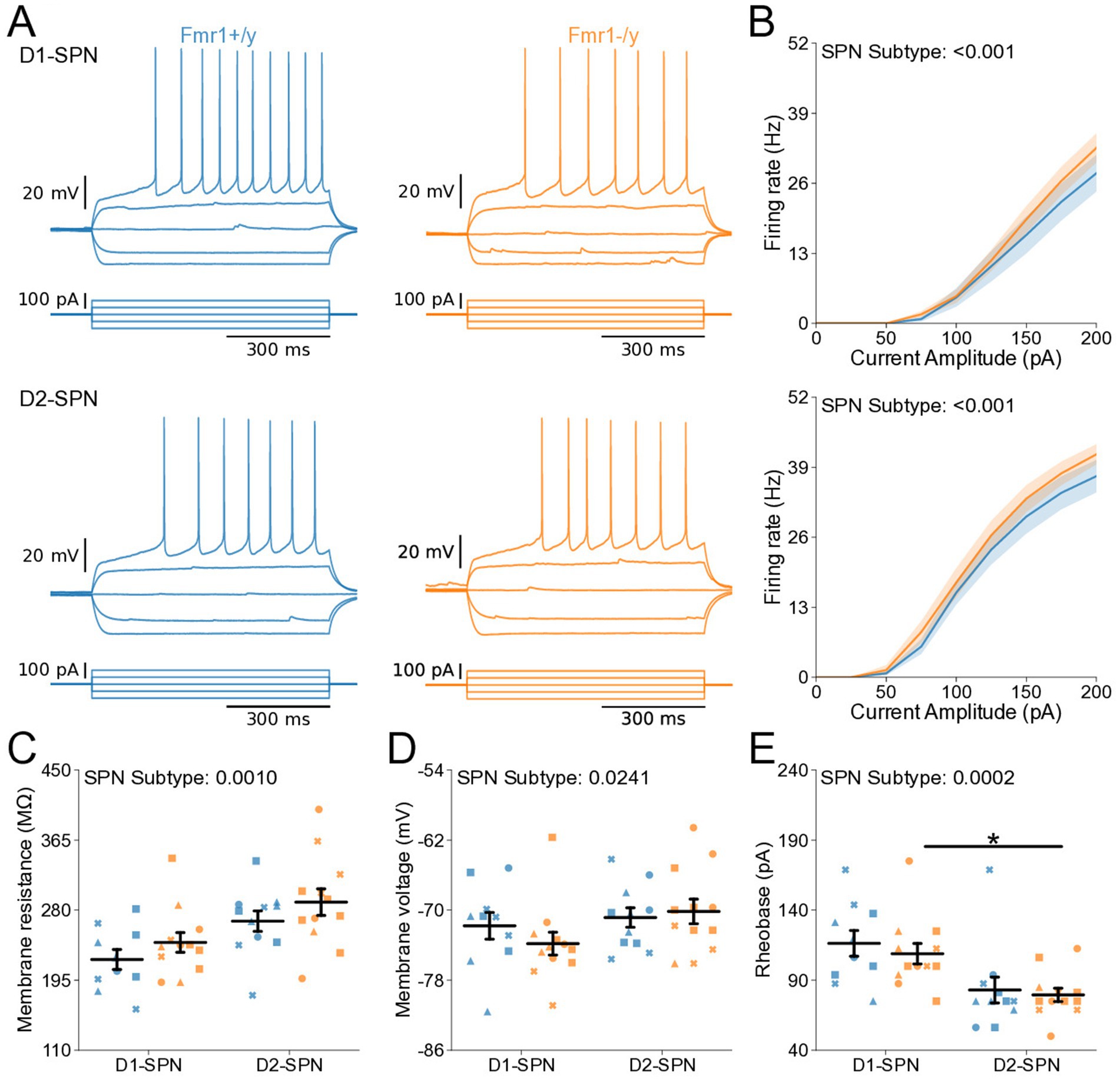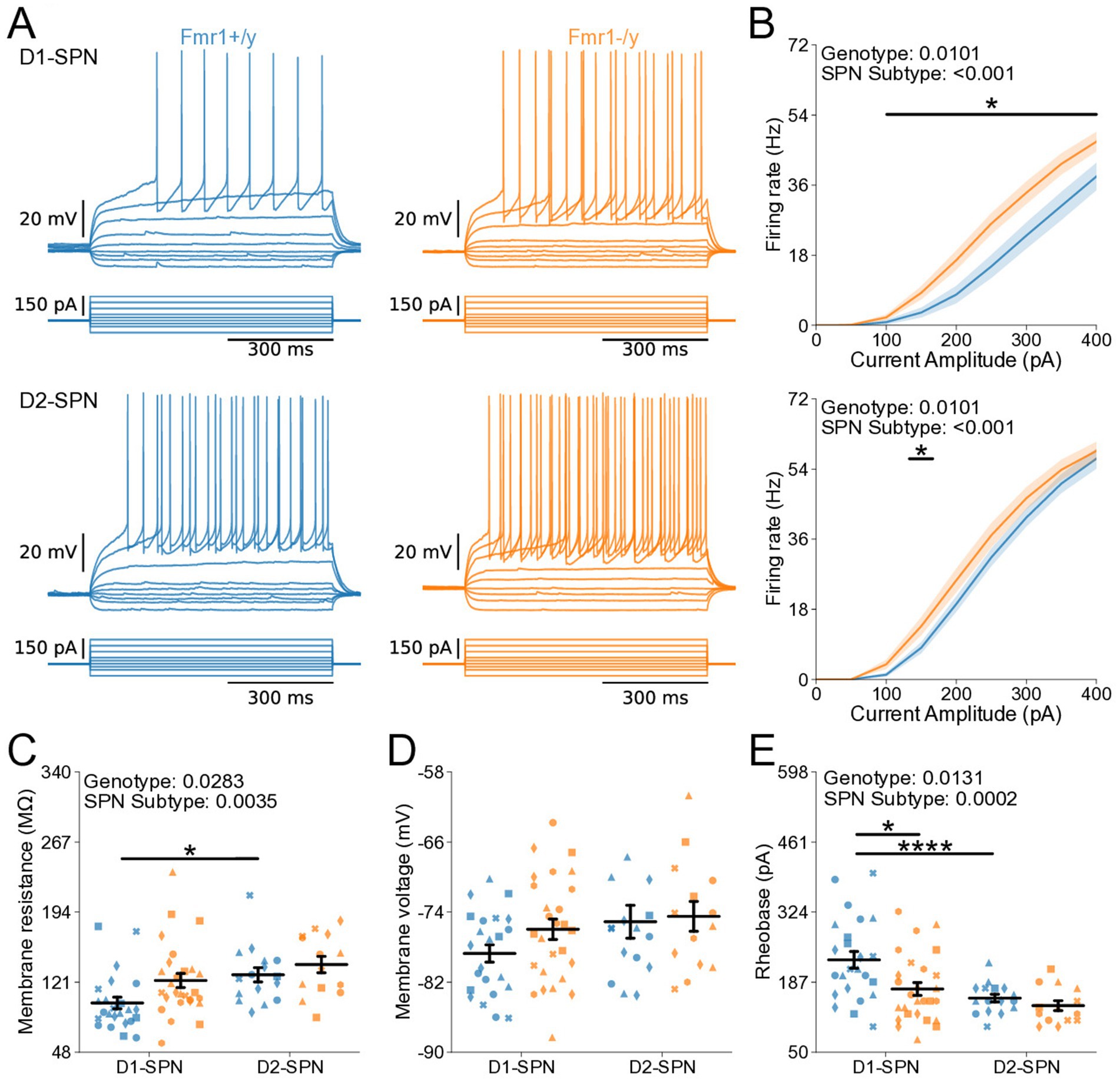 Figure 2. Normal intrinsic excitability and passive membrane properties of D1- and D2-SPNs in P14-P15 Fmr1−/y mice. (A) Representative current-clamp recordings showing action potential firing in response to current injections in D1-SPNs (top) and D2-SPNs (bottom) of Fmr1−/y (orange) and Fmr1+/y (blue) P-15 mice. n = 20, 18 D1- and D2-SPN cells from N = 4 Fmr1+/y mice; n = 11, 14 D1- and D2-SPN cells from N = 4 Fmr1−/y mice (B) Input–output relationship of firing frequency versus current amplitude (I-F curves) in D1- and D2-SPNs (top and bottom respectively). (C) Average membrane resistance in D1- and D2-SPNs. (D) Average resting membrane potential in D1- and D2-SPNs. (E) Average rheobase current in D1- and D2-SPNs. Plots show individual data points, with shape representing a mouse within the group (i.e., Fmr1−/y x D1-SPN) and the summary with mean ± SEM. *p < 0.05, **p < 0.01, ***p < 0.005, ****p < 0.001 for multiple comparisons.