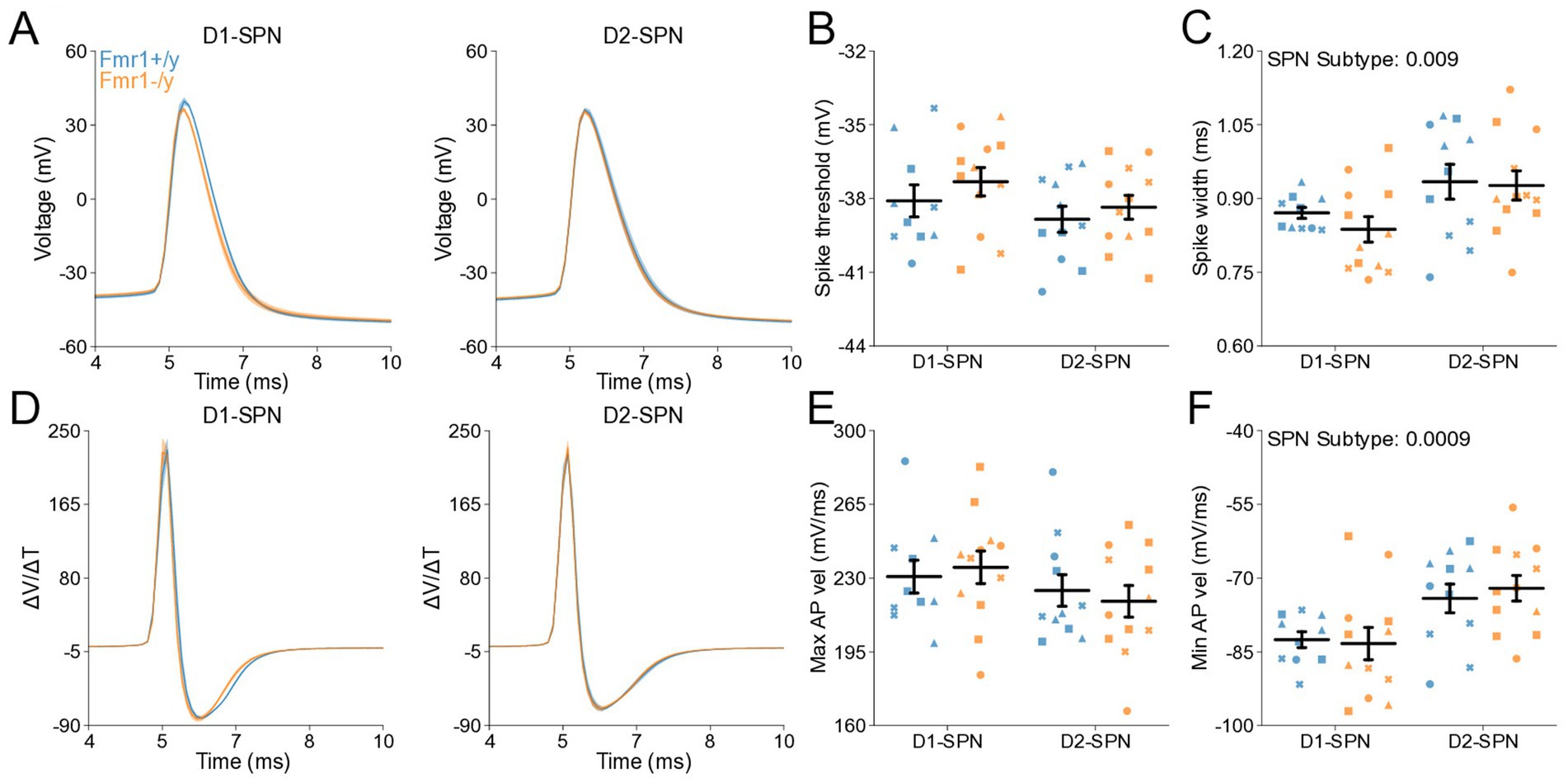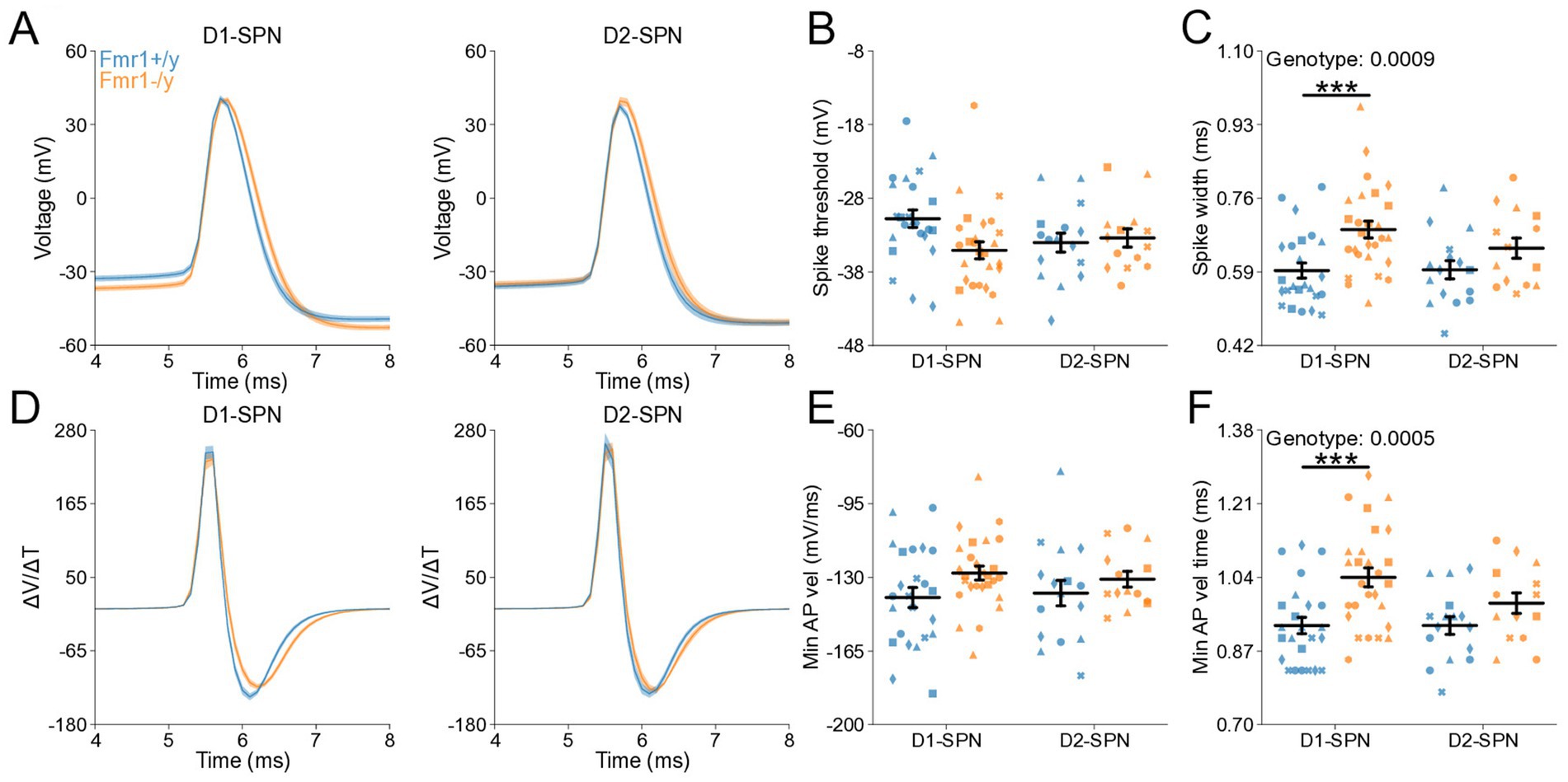 Figure 6. Action potential properties in D1- and D2-SPNs of adult P60 Fmr1−/y mice. (A) Representative single action potential traces recorded from D1-SPNs (left) and D2-SPNs (right) of Fmr1−/y (orange) and Fmr1+/y (blue) P60 mice. n = 24, 16 D1- and D2-SPNs from N = 5 Fmr1+/y mice; n = 27, 14 D1- and D2-SPNs from N = 6 Fmr1−/y mice. (B) AP threshold potential and (C) AP half-width in D1- and D2-SPNs. (D) AP velocity (∆V/∆t) (left and right respectively). (E) Minimum AP velocity. (F) Time of the minimum AP velocity. Plots show individual data points, with shape representing a mouse within the group (i.e., Fmr1−/y x D1-SPN) and the summary with mean ± SEM. *p < 0.05, **p < 0.01, ***p < 0.005, ****p < 0.001.