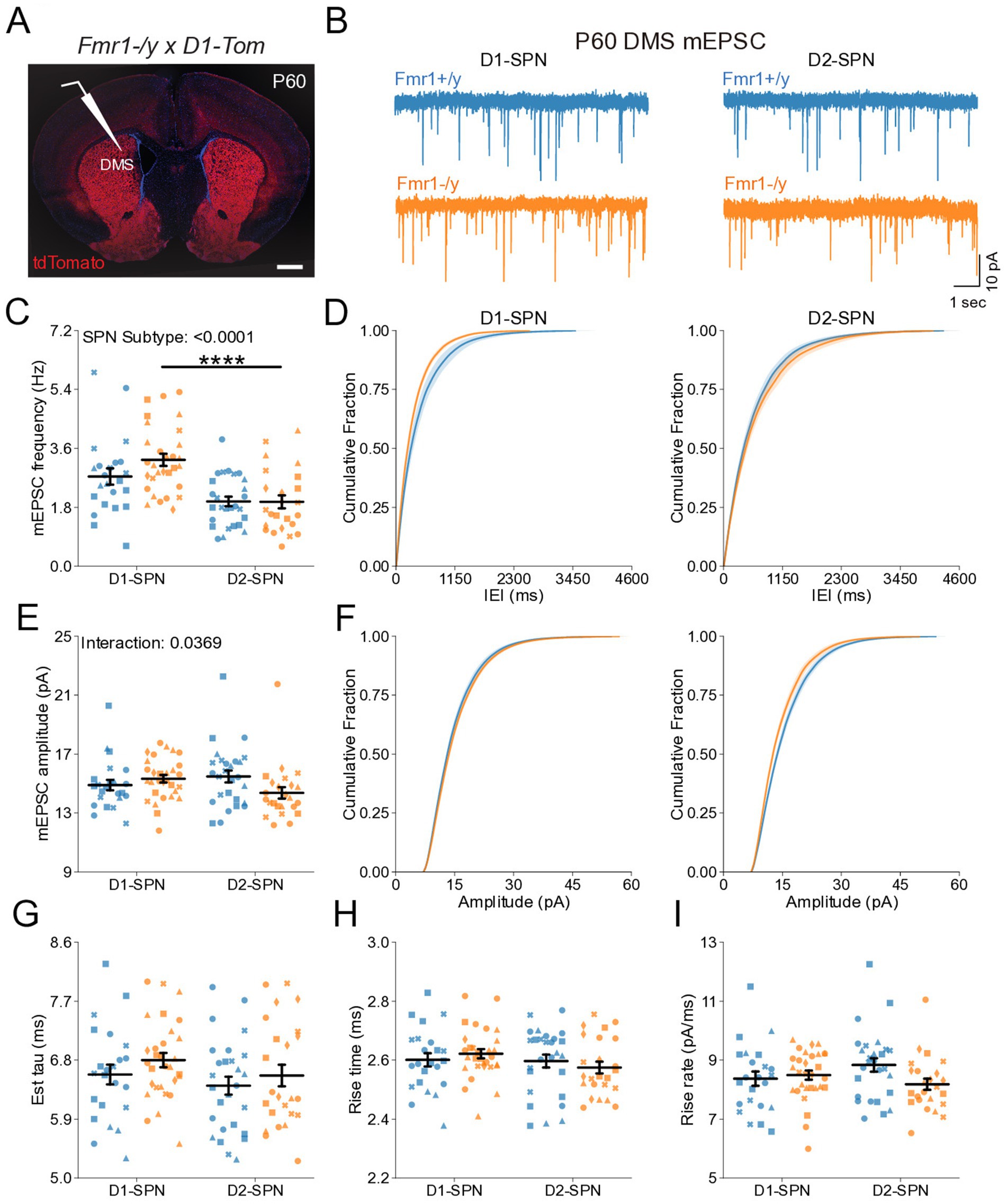 Figure 4. Normal glutamatergic synaptic transmission in D1- and D2-SPNs of the DMS in adult (P60) Fmr1−/y mice. (A) Schematic representing a coronal brain section and whole-cell recordings of D1-SPNs (labeled with D1-Tomato) and D2-SPNs in the DMS of P60 Fmr1−/y and Fmr1+/y mice. (B) Representative AMPAR-mediated mEPSCs in D1-SPNs (left) and D2-SPNs (right) of Fmr1−/y (orange) and Fmr1+/y (blue) mice. n = 23, 28 D1- and D2-SPNs from N = 4 Fmr1+/y mice; n = 30, 24 D1- and D2-SPNs from N = 5 Fmr1−/y mice (C) Average mEPSC frequency. (D) Cumulative distribution of inter-event intervals (IEIs) of mEPSCs in D1- and D2-SPNs (left and right respectively). (E) Average mEPSC amplitude. (F) Cumulative distribution of mEPSC amplitudes in D1- and D2-SPNs (left and right, respectively). (G) Average mEPSC decay tau, (H) rise time and (I) rise rate. Plots show individual data points with shape representing a mouse within the group (i.e., Fmr1−/y x D1-SPN) and the summary with mean ± SEM. *p < 0.05, **p < 0.01, ***p < 0.005, ****p < 0.001.