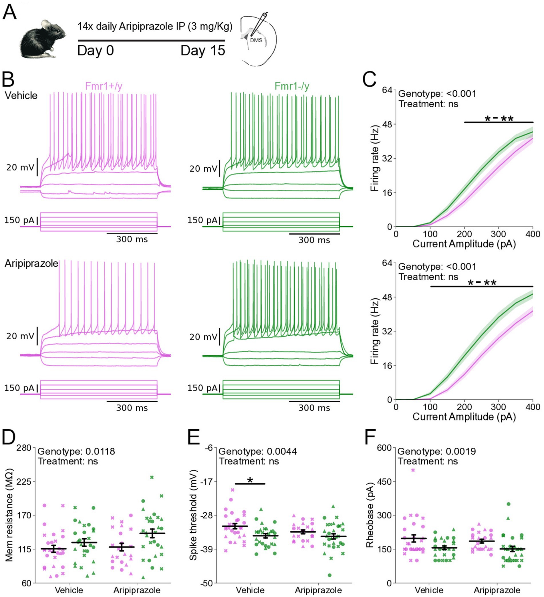 Figure 7. Chronic aripiprazole treatment does not ameliorate hyperexcitability in SPNs of Fmr1−/y mice. (A) Schematic showing daily intraperitoneal (IP) injections of aripiprazole (3 mg/kg) in adult mice for 14 days, followed by whole-cell recordings of SPNs in the DMS. (B) Representative current-clamp recordings showing action potential firing in response to current injections in D1-SPNs (top) and D2-SPNs (bottom) of Fmr1+/y (purple) and Fmr1−/y (green) P60 mice. n = 22 cells from N = 3 Fmr1+/y x Aripiprazole mice; n = 28 cells from N = 3 Fmr1+/y x Vehicle mice; n = 29 cells from N = 3 Fmr1−/y x Aripiprazole mice; n = 26 cells from N = 3 Fmr1−/y x Vehicle mice (C) Input–output relationship of firing frequency versus current amplitude (I-F curves) in SPNs from Fmr1−/y and Fmr1+/y mice treated with vehicle (top) or aripiprazole (bottom). (D) Average membrane resistance. (E) Average AP threshold (F) Average rheobase current. Plots show individual data points, with shape representing a mouse within the group (i.e., Fmr1−/y x D1-SPN) and the summary with mean ± SEM. *p < 0.05, **p < 0.01, ***p < 0.005, ****p < 0.001.
