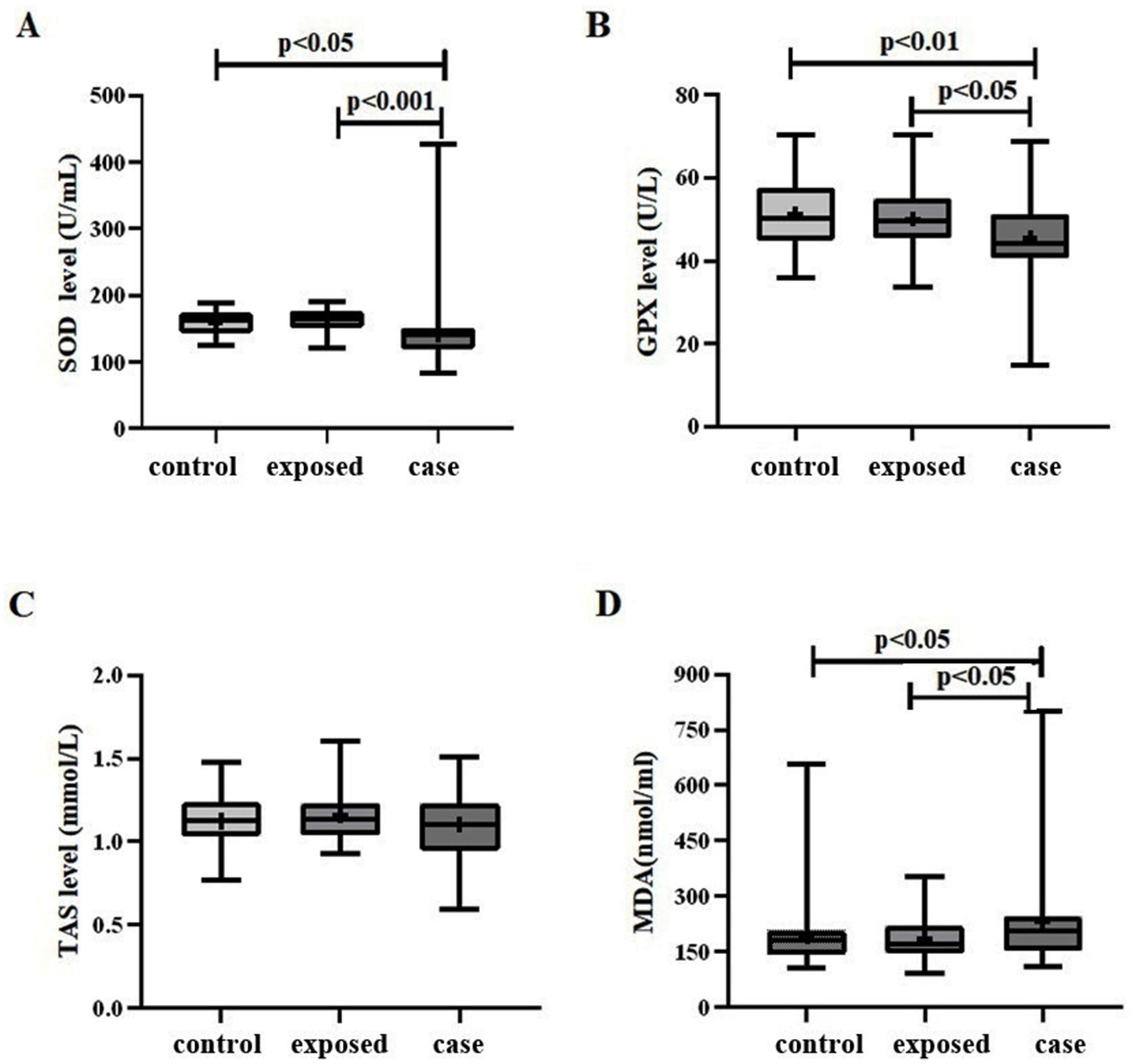 The levels of antioxidant indicators SOD, GPX and TAS were significantly reduced in the case group relative to both the control group and the exposed group, with the exposed group exhibiting the highest levels among the three groups (Figure 1). Conversely, the concentration of MDA, an indicator of oxidative damage, was elevated in the case group compared to the control group and the exposed group, with the control group demonstrating the lowest levels among the three groups.