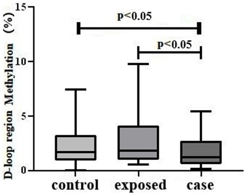 The levels of mtDNA D-loop methylation were significantly reduced in the case group relative to both the control group and the exposed group, with the exposed group exhibiting the highest levels among the three groups (Figure 2).
