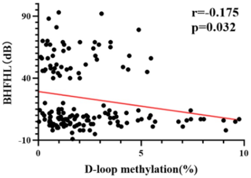 Figure 3. The correlation between DNA methylation levels and average hearing threshold of high-frequency bilateral ears in all subjects. The methylation level of the mtDNA D-loop region exhibits a statistically significant negative correlation with the average hearing threshold of high-frequency bilateral ears (r = −0.175, p < 0.05).