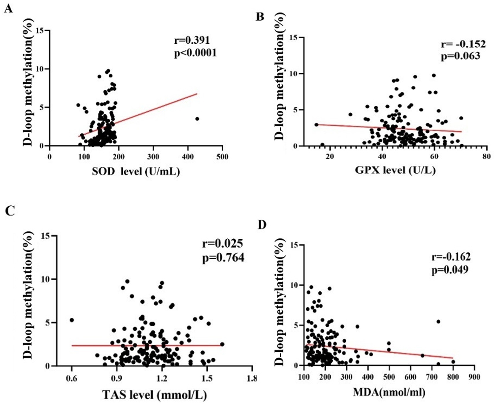 Figure 4. The correlation between DNA methylation levels and oxidative stress level in all subjects. (A) The methylation level of the mitochondrial DNA (mtDNA) D-loop region exhibits a statistically significant positive correlation with superoxide dismutase (SOD) (r = 0.391, p < 0.01). (B) The correlation between the methylation level of the mtDNA D-loop region and glutathione peroxidase (GPX) is weak (r = −0.152, p = 0.063) and not statistically significant. (C) The methylation level of the mtDNA D-loop region shows a positive correlation with total antioxidant status (TAS) (r = 0.025, p = 0.764), which is not statistically significant. (D) The methylation level of the mtDNA D-loop region is negatively correlated with malondialdehyde (MDA) (r = −0.162, p < 0.05), and this correlation is statistically significant.
