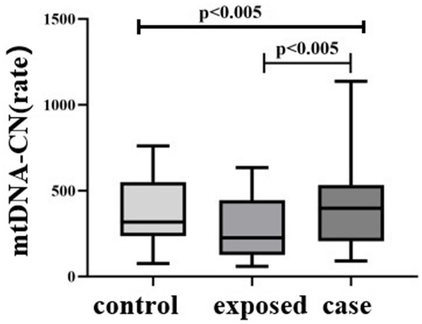 The differences in mtDNA-CN levels among the three groups were statistically significant (H = 9.213, p < 0.01), with the case group [397.7 (205.9, 532.1)] exhibiting higher levels compared to the control group [317.4 (234.6, 549.6)]. Additionally, the case group demonstrated significantly higher mtDNA-CN levels than the exposed group [225.1 (125.3, 445.0)], p < 0.05. Notably, the case group had the highest mtDNA-CN levels overall (Figure 5).