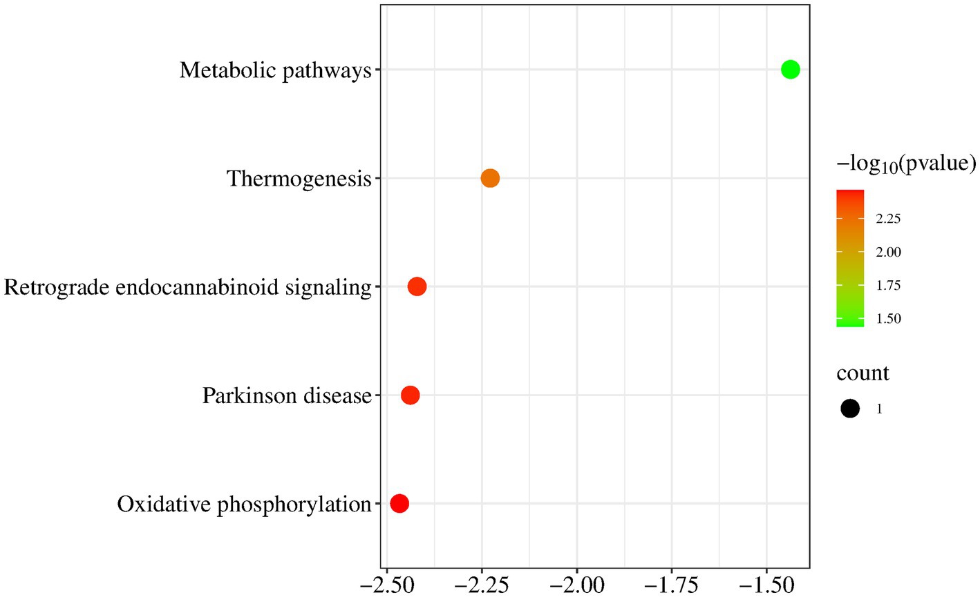 Figure 6. KEGG pathway analysis. KEGG pathway analysis of mitochondrial genes revealed a significant correlation between the MT gene and Metabolic pathways and Thermogenesis and Retrograde endocannabinoid signaling and Parkinson disease and Oxidative phosphorylation.