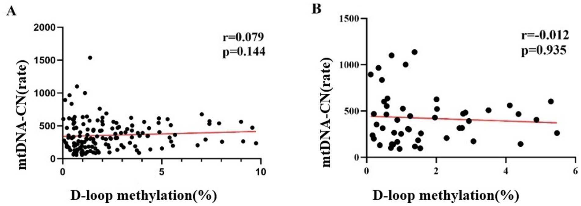 Figure 7. Correlation between mtDNA-CN levels and DNA Methylation Level The methylation level of the mtDNA D-loop region across the three study groups exhibited a positive correlation with mtDNA copy number; however, this association did not reach statistical significance (r = 0.079, p = 0.144) (A). Within the case group, the methylation level of the mtDNA D-loop region demonstrated a negative correlation with mtDNA copy number. Specifically, a decrease in methylation level corresponded with an increase in copy number, yet this relationship was not statistically significant (r = −0.012, p = 0.935) (B).