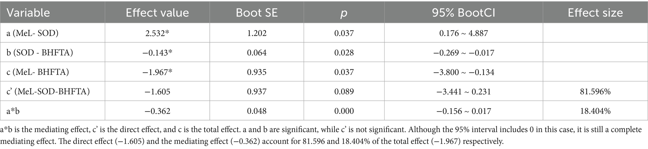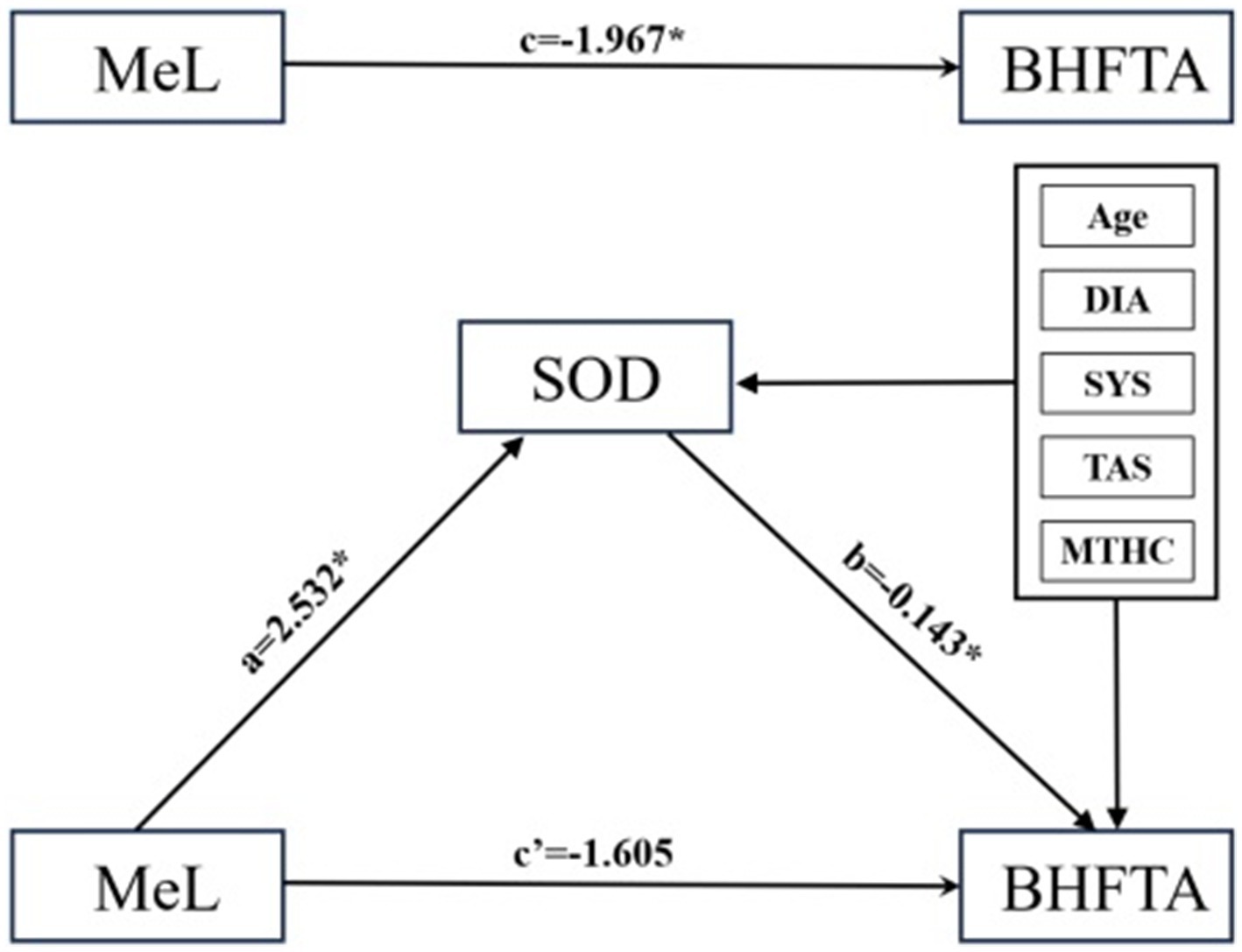 Figure 8. Mediating effect model. X, Y, M are the path coefficients between the control variables. Introduce SOD as the mediator variable, with age, diastolic pressure, systolic pressure, TAS, and mitochondrial copy number as control variables, and substitute them into the structural equation model. a represents the effect value of MeL on SOD, b represents the effect value of SOD on BHFTA, a*b represents the mediating effect, c’ represents the direct effect, and c represents the total effect.