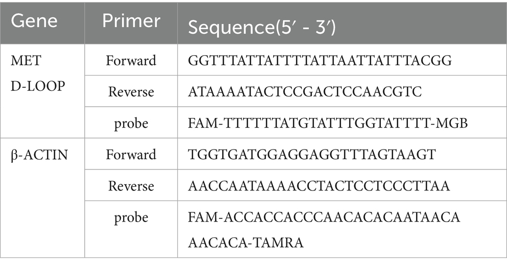 The quantitative PCR (qPCR) reaction system and conditions were established following the guidelines provided by the SuperReal Color Fluorescent Quantitative Pre-Mix Kit. The reagents included in the kit were thoroughly mixed by inversion and subsequently centrifuged immediately. Amplifcation of the two reactions using primer Forward and primer Reverse of 0.5 each μL (pmol/μL). Probe 0.6 μL (pmol/μL). Water 4.4 μL. SuperReal Permix 10 μL. DNA template 4 μL. 20 in total μL (Table 1). The reaction system was assembled on ice and subsequently aliquoted into eight tubes devoid of RNA enzymes for machine detection. Each sample was analyzed in triplicate wells. The proportion of DNA methylation was calculated using the CT difference method based on literature (Park et al., 2021). The PCR amplification parameters for the D-loop and β-actin gene were established as follows: an initial denaturation at 95 °C for 15 min, followed by 45 cycles of denaturation at 95 °C for 3 s, and annealing/extension at 57 °C for 45 s. Mitochondrial DNA copy number detection samples are derived from peripheral blood samples. For this study, hemoglobin, beta gene and Mitochondrial DNA Copy Number Analysis.