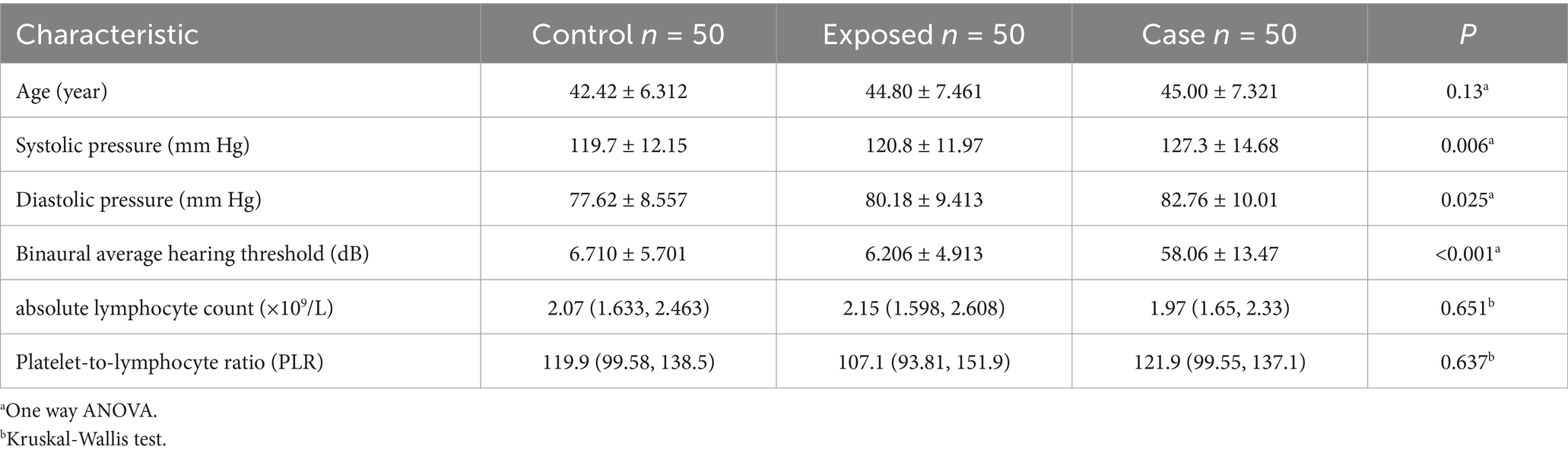 This study recruited a total of 150 participants and divided them into three groups. Within the population engaged in noisy occupations, 50 confirmed cases of noise-induced hearing loss were selected to constitute the case group. Additionally, 50 noise-exposed workers with normal hearing, as determined by their occupational health examinations, were selected to form the exposed group. A control group was composed of 50 employees with normal hearing who had never employed hearing examinations for noise-related occupations. All groups of study subjects were matched for gender and age (±5 years). Inclusion criteria: ① Case and exposed groups: subjects with occupational noise exposure for ≥3 years; control group: subjects without occupational noise exposure. ② According to GBZ49-2014 “Diagnosis of Occupational Noise-Induced Hearing Loss,” the case group was diagnosed with occupational NIHL, defined as a bilateral high-frequency (3,000 Hz, 4,000 Hz, 6,000 Hz) average hearing threshold of ≥40 dB. For the control group and exposed group, normal hearing was defined as a high-frequency average threshold of <35 dB and a pure tone audiometry threshold of ≤25 dB at any frequency range (500 Hz, 1,000 Hz, and 2000 Hz) in either ear. Exclusion criteria: Participants were excluded if they had any of the following conditions: pseudohypacusis, exaggerated hearing loss, drug-induced ototoxicity (e.g., Streptomycin, Kanamycin, Chloramphenicol), traumatic hearing loss, infectious diseases (such as epidemic cerebrospinal meningitis, mumps, and measles), hereditary deafness, Meniere’s disease, sudden deafness, middle ear diseases, acoustic neuroma, or auditory nerve diseases. A 7.0 mL sample of upper limb venous blood should be collected from each experimental subject and aliquoted into two types of tubes: (1) regular biochemical tubes (without anticoagulant) and (2) EDTA-anticoagulant tubes. Two milliliters of peripheral blood were collected in EDTA anticoagulant tubes for use as the detection sample, and routine blood tests were conducted using a hematology analyzer (Mindray BC5000, Shenzhen China). Data on the study subjects’ age, blood pressure, occupational exposure duration, and bilateral high-frequency average threshold were retrieved from the Electronic Health Record System. The study cohort comprised both confirmed patients and healthy individuals who underwent medical examinations at the Shenzhen Occupational Disease Prevention and Treatment Center. This study was approved by the Ethics Committee of the Shenzhen Occupational Disease Prevention and Treatment Center, and all study subjects provided informed consent.