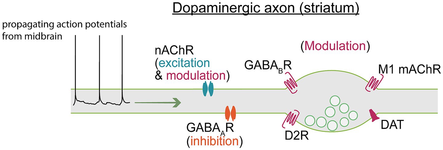 Modulation of neuronal circuits via hormones, peptides, and neurotransmitters enables fine-tuned signal adaptations. Many studies examining the effects of endogenous modulators and exogenous drugs on neuronal excitability have been focused on responses in the soma due to its experimental accessibility. Some studies have been able to access the AIS, but few have been able to record the properties of distal axons. Of particular interest is the role of neurotransmitters that activate ion permeable receptors along the axon. In this section, we will discuss what is known about how neurotransmitters, and exogenous drugs, alter the excitability of dopaminergic axons to locally control dopamine release (Figure 2).