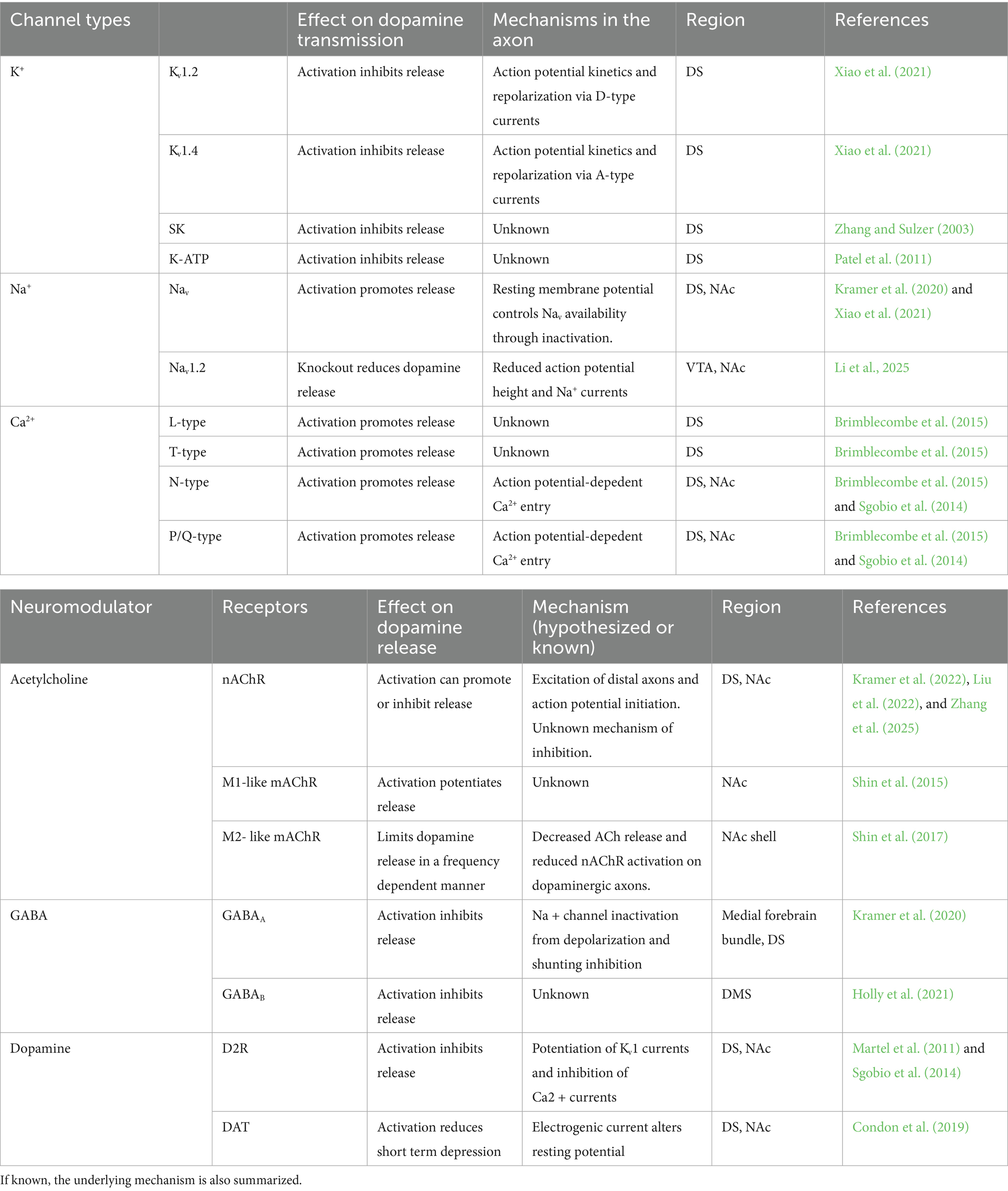 Table 1. The key channels and receptors that are known to control dopamine release through modulation of axonal excitability.