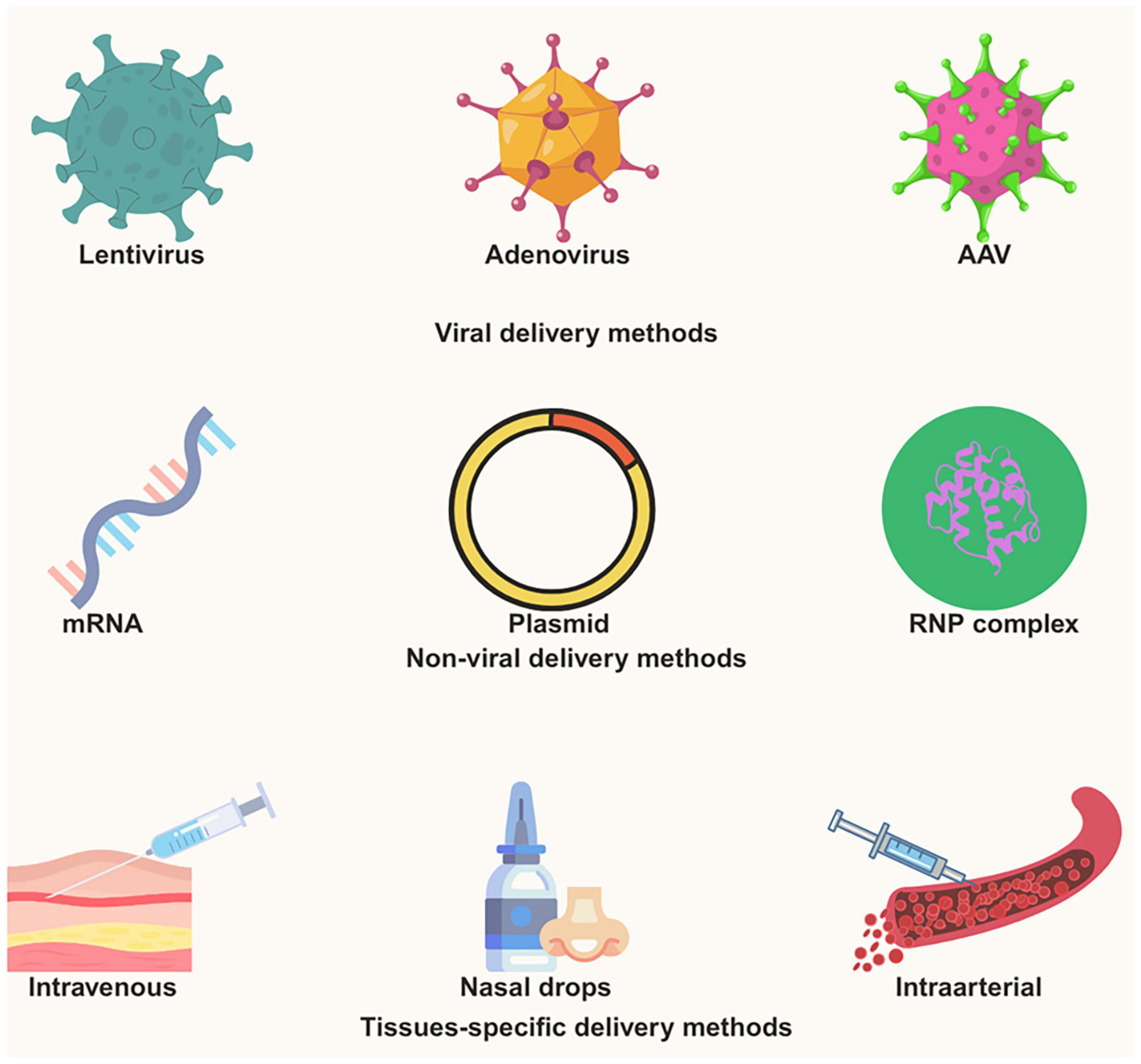 The CRISPR components are usually injected into the cells to alter the genes in mammalian cells for therapeutic purposes. Mostly mRNA, viral, plasmid, as well as protein-based techniques are employed to transport the CRISPR/Cas9 elements within the cellular environments (Lino et al., 2018). Among these approaches, viral-mediated delivery represents the most employed strategy for CRISPR/Cas9 administration (Figure 2). To achieve this, a variety of virus delivery systems have been used that includes lentiviral vectors (LV), adenoviral vectors (AdV), and adeno-associated viruses (AAV) (Wang et al., 2017, 2019; Naldini, 2015; Daya and Berns, 2008). For the following reasons, they are frequently utilized in CRISPR genomic modification: The first benefit of using AAVs for illness treatment is their ability to penetrate the target cell and survive without the help of the host cell’s genome (Daya and Berns, 2008; Wang et al., 2019). Second, because of their varied capsids, AAVs can infect a range of tissues. The other advantages of using AAVs also include tissue tropism, episomal persistence in non-dividing cells, and low genomic integration rates (Bulcha et al., 2021).