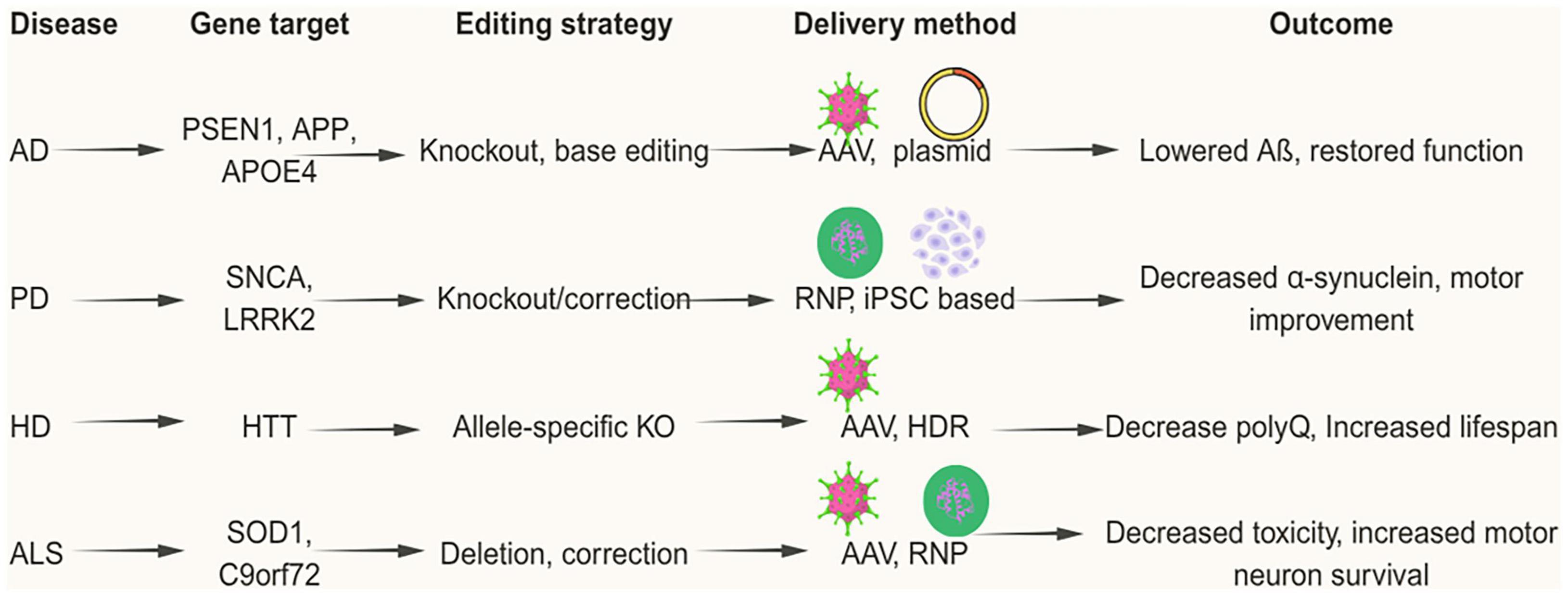 Keywords: CRISPR-Cas9, gene editing, neurodegenerative diseases, Alzheimer’s disease, Parkinson’s disease, Huntington’s disease, amyotrophic lateral sclerosis (ALS), aging