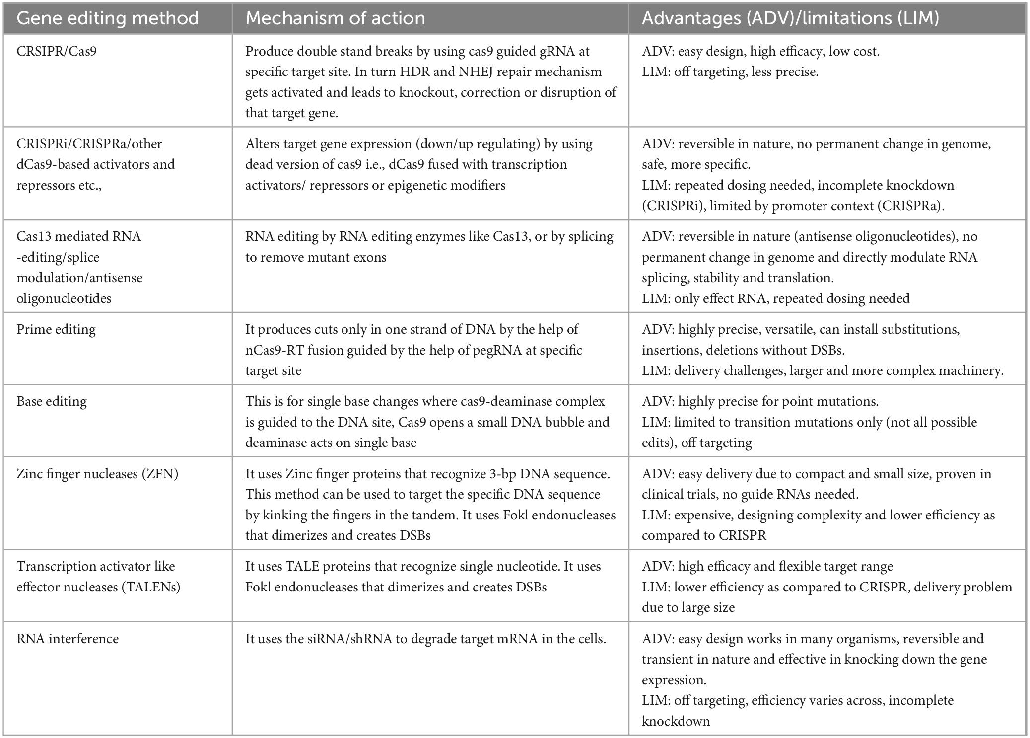 A complicated structure with several domains, the Cas9 protein is divided into two separate sections referred to as the recognition (REC) lobe and the nuclease (NUC) lobe. A bridge helix (BH) with an elevated level of arginine residues connects these two lobes (Nishimasu et al., 2014). In order to allow the Cas9 protein to attach to the target DNA, the NUC lobe of Cas9 has a PAM-interacting domain in addition to two endonuclease domains, HNH and RuvC. Each of these two domains cuts a single strand of DNA, producing double-stranded DNA. Furthermore, SpCas9’s REC lobe is made up of many recognition domains (REC1-REC3) that let SpCas9 connect to DNA and RNA. Cas9 can function as a modifiable instrument to generate chromosomal double-strand cleavages in vitro and in vivo due to its strong and dependable activity (Jinek et al., 2014). As a result, CRISPR/Cas9 has evolved into a straightforward and adaptable RNA-guided genomic modification platform that can be implemented across diverse organisms and cellular populations, encompassing pigs, mice, rats, zebrafish, bacteria and human cells for the treatment of diseases (Hsu et al., 2014). Table 1 shows the comparison of different gene editing and gene regulation technologies, highlighting their respective advantages and limitations, but among these, the CRISPR/Cas9 has been widely adopted due to its ease in designing, cost-effectiveness and high efficacy. The foremost application of CRISPR/Cas9 in therapeutic applications occurred in 2016. Patients with advanced lung cancer were treated by a Chinese team using cells that had been altered using CRISPR/Cas9 (Cyranoski, 2016). Many clinical trials have been carried out in recent years, and a number of the results have been reported in published literature. These results include the application of CRISPR/Cas9-linked therapies for diseases like β-thalassemia, sickle cell disease (SCD), acquired immunodeficiency syndrome (AIDS), and various malignancies (Cyranoski, 2016; Frangoul et al., 2021; Xu et al., 2019).