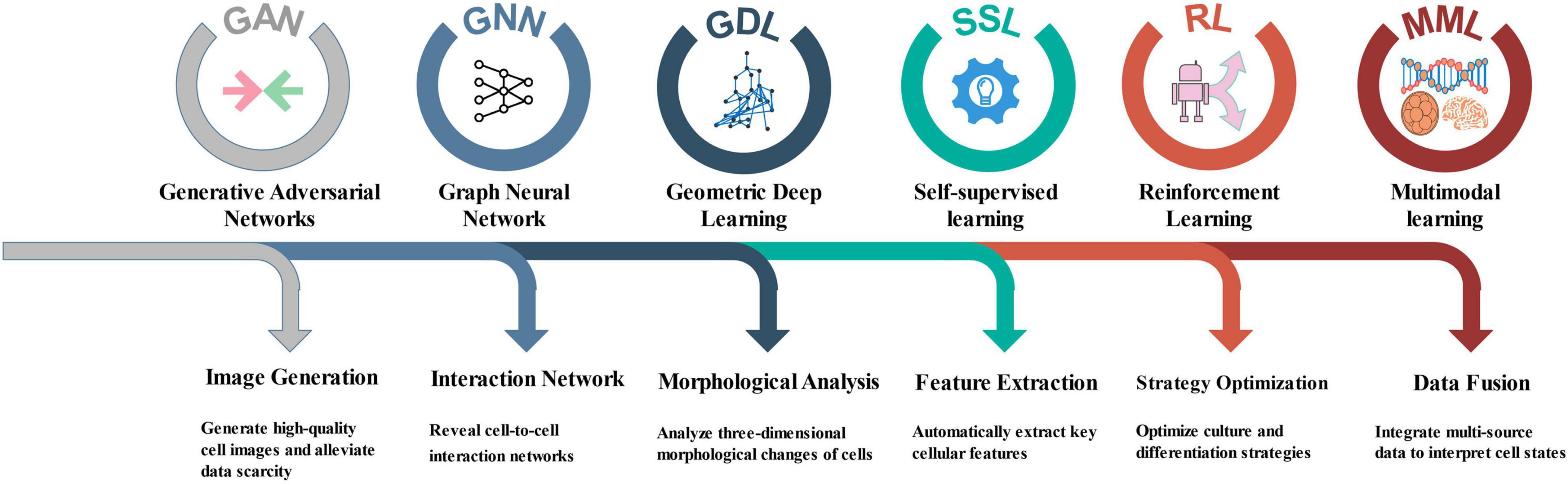 Reinforcement Learning (RL) in cell biology research can achieve precise regulation and functional enhancement of cell behavior through dynamic interaction between agents and the environment, continuously optimizing experimental strategies based on feedback signals. Wang et al. (2022) used deep RL to infer intercellular interactions and collective cell behavior in tissue morphogenesis from 3D delayed images, in order to examine cell migration. In NSCs research, RL can be used to optimize cell culture conditions, differentiation induction schemes, and drug screening processes. When combined with the early prediction capabilities described in section “2.5 Early non-invasive prediction of differentiation fate mediated by deep learning,” RL could enable adaptive optimization of differentiation protocols in real-time, potentially uncovering optimal temporal sequences of cues that maximize differentiation efficiency toward specific lineages.