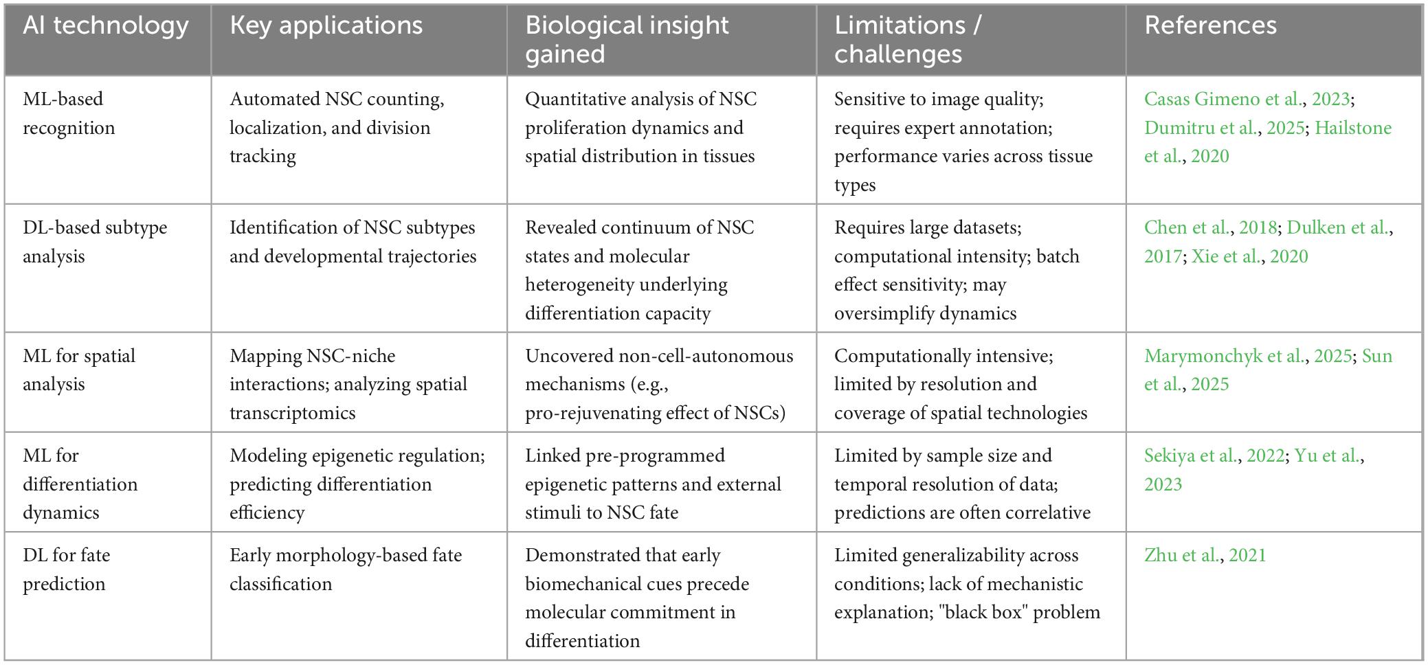 The application of these AI-related technologies provides strong support for the intelligent identification of NSCs and lays the foundational groundwork for further NSC research. Importantly, these approaches have transformed our understanding by enabling quantitative analysis of NSC behavior within their native tissue context. Nevertheless, the effectiveness of these tools can be influenced by factors such as the requirement for high-quality annotated data for training (Hailstone et al., 2020; Stringer et al., 2021) and potential sensitivity to complex tissue architectures and imaging conditions, which may impact generalizability across diverse experimental settings.