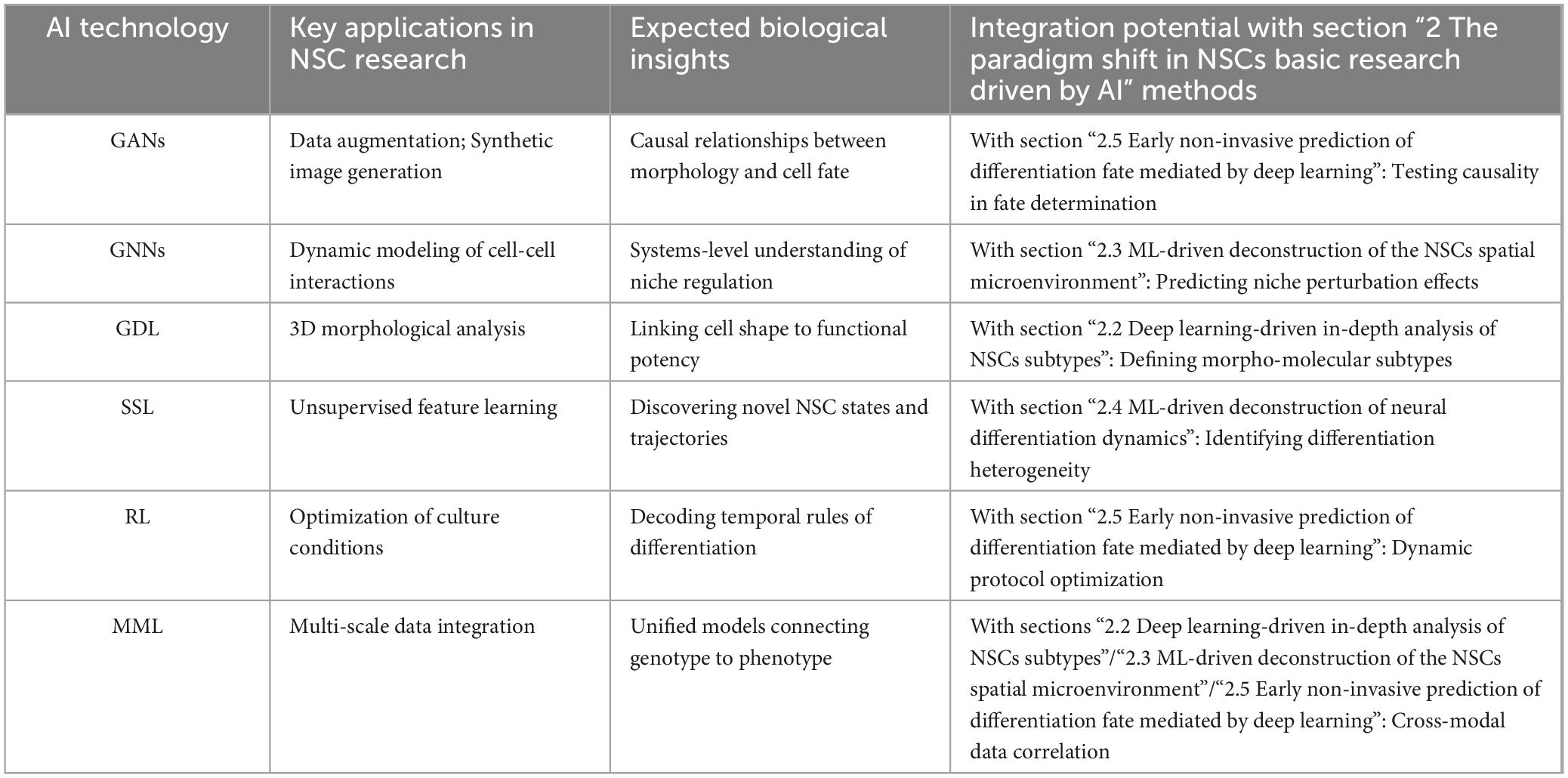 Although current applications of AI technologies in NSC research remain relatively limited, these emerging techniques are expected to play increasingly significant roles as they continue to develop and mature. By integrating advanced technologies such as GNN, GAN, and GDL et.al, researchers will be able to achieve a more comprehensive understanding of the biological characteristics, differentiation mechanisms, and regenerative potential of NSCs. This not only provides new tools for basic research but also opens up new possibilities for clinical applications and personalized therapies.