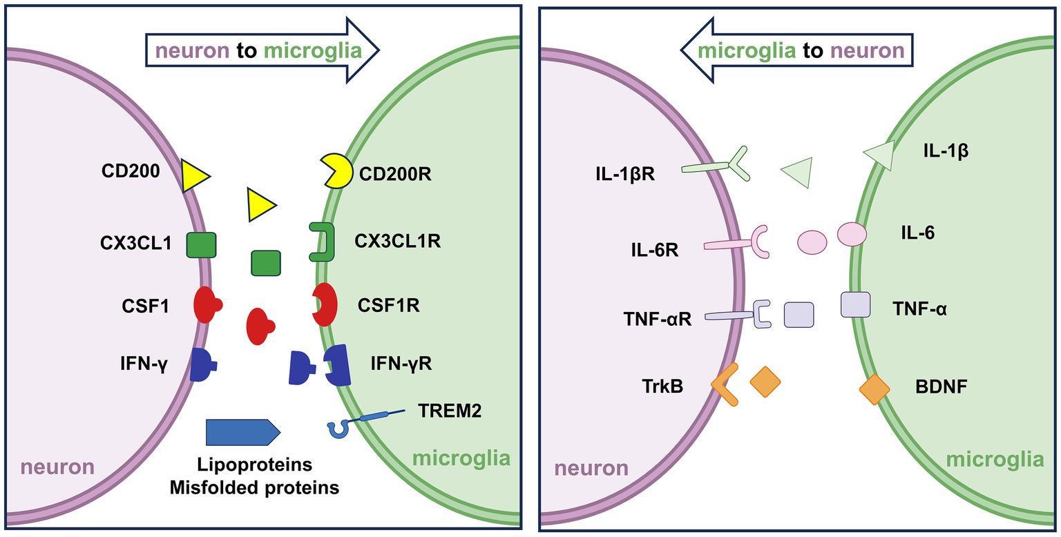 Figure 1. Neuron–microglia interactions under physiological conditions. (Left) Neurons secrete signaling molecules such as CX3CL1, CSF1, and IFN-γ, which bind to their respective microglial receptors, CX3CL1R, CSF1R, and IFN-γR, to regulate microglial surveillance and activation. Additionally, neuronal CD200 interacts with microglial CD200R to maintain microglial quiescence. (Right) Activated microglia release pro-inflammatory cytokines, including IL-1β, IL-6, and TNF-α, which bind to neuronal receptors IL-1βR, IL-6R, and TNF-αR, respectively. These bidirectional interactions coordinate immune homeostasis and contribute to the maintenance of neuronal and synaptic integrity.