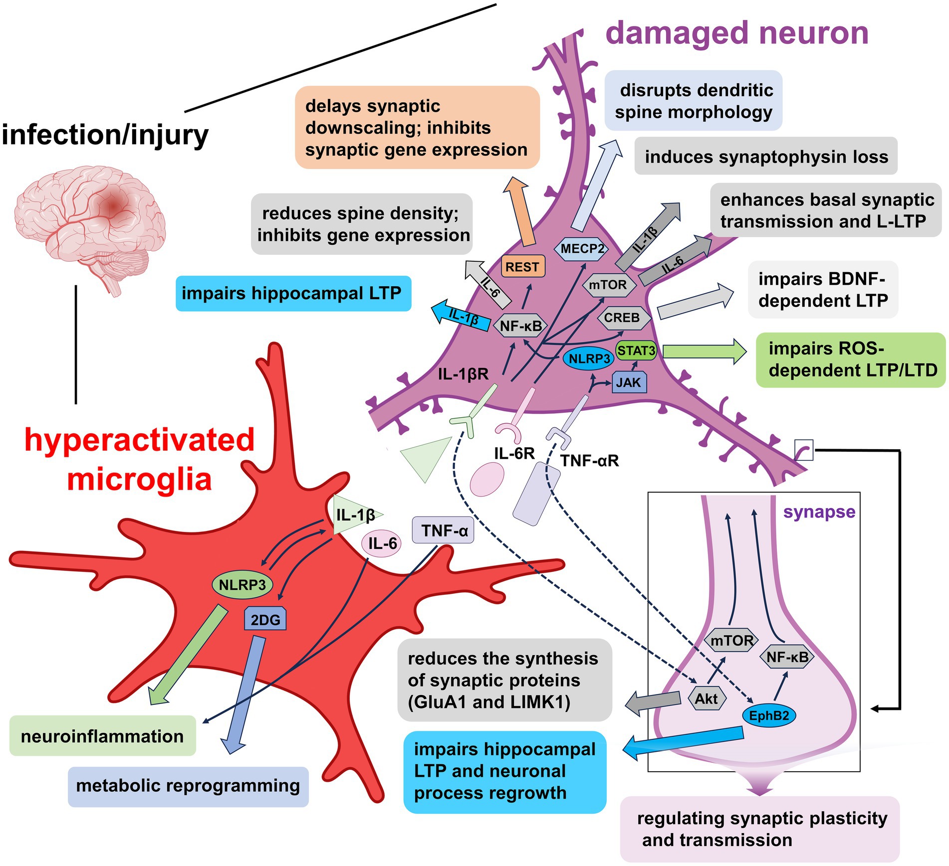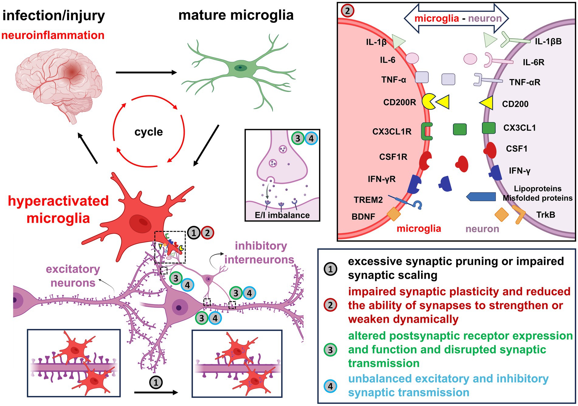 Under physiological conditions, microglia actively participate in the formation, elimination, and functional modulation of synapses. While some synaptic alterations are cell-autonomous, mounting evidence points to non-cell-autonomous mechanisms wherein microglia exert regulatory control over synaptic architecture and function. A key mechanism involves immune-related molecules, including cytokines and their receptors, that mediate communication between activated microglia and synaptic elements (Wake et al., 2019). These molecules are rapidly induced in response to disease, trauma, or infection and drive synaptic structural remodeling. In turn, altered synaptic states can further activate microglia, thereby creating a feed-forward loop that reinforces inflammation and disrupts synaptic homeostasis. This bidirectional interaction forms a mechanistic link between microglial overactivation and synaptic dysfunction.