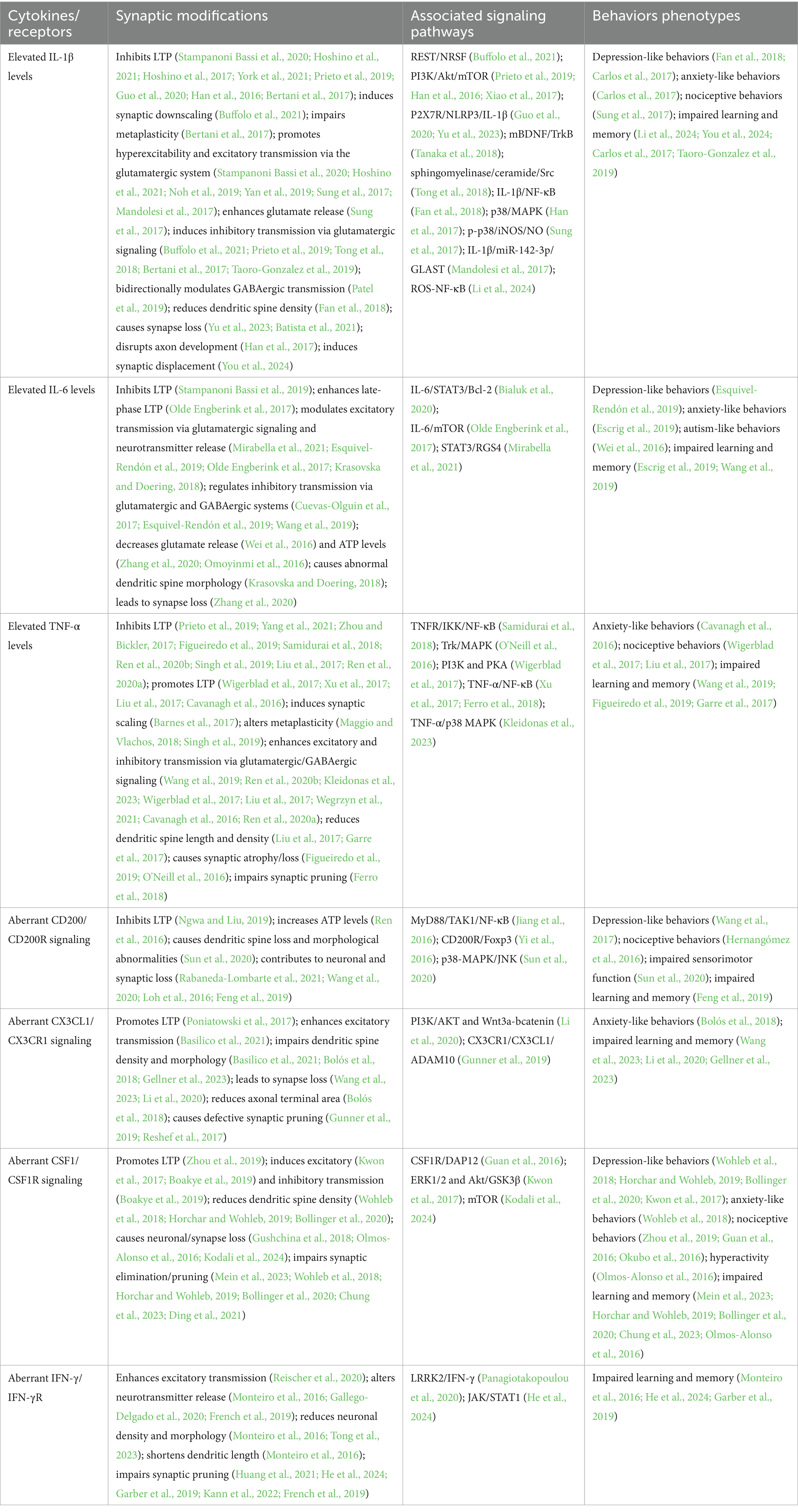 Table 1. Negative regulation of synaptic modifications and behavioral correlates by microglial pro-inflammatory factors/receptors.