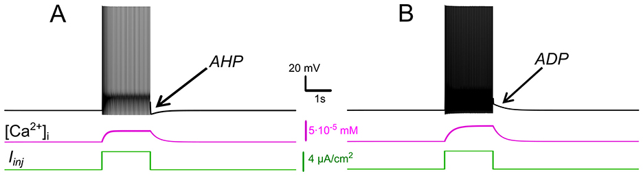 Our simulations show that when IKCa predominates, Ca2+ -dependent potassium efflux produces hyperpolarization of the membrane and a decrease in excitability. This effect promotes a prominent post-stimulus AHP supported by sustained [Ca2+]i elevation (Figure 1A). Conversely, when ICANpredominates, the elevation of [Ca2+]i activates this current, leading to a depolarizing influx of sodium, that in turn increases the firing frequency during the pulse and yields an sADP afterward (Figure 1B). As [Ca2+]i declines, the membrane potential slowly relaxes back toward its resting values.