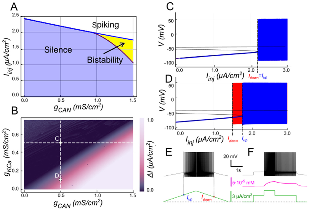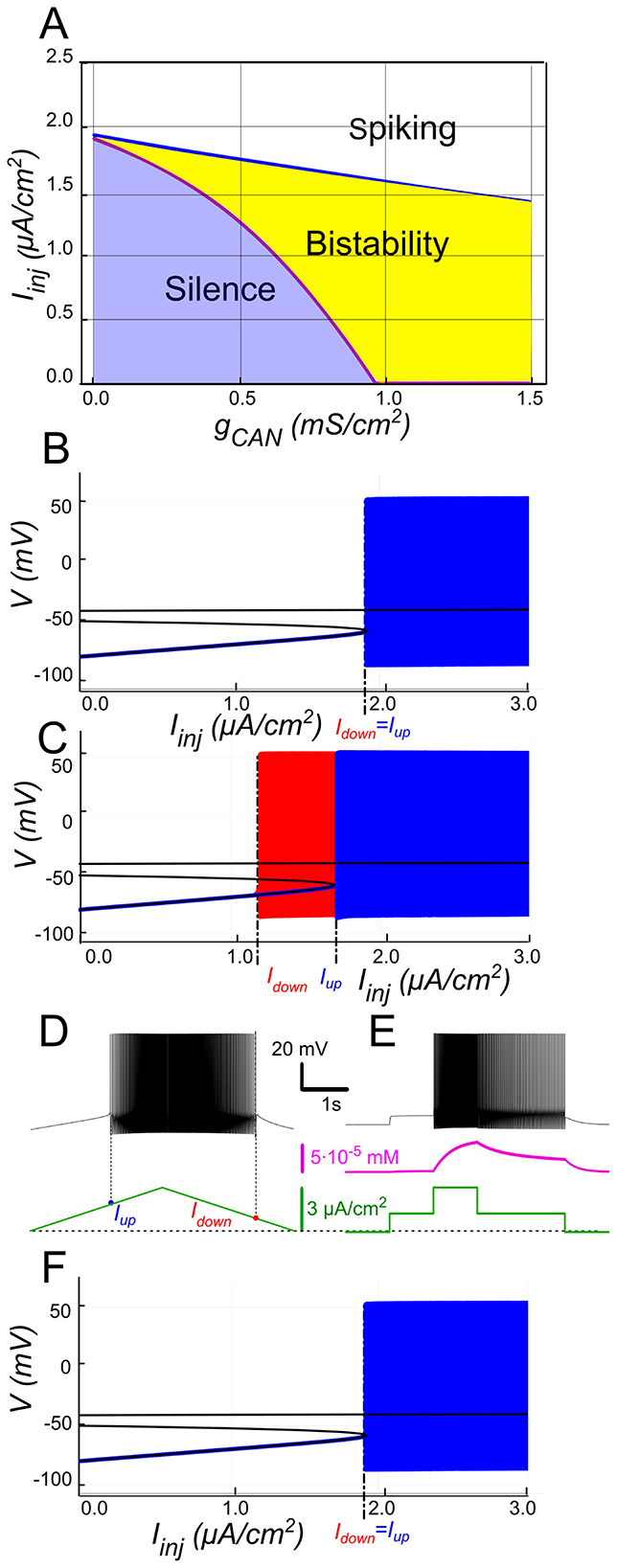 Figure 2. ICAN-induced bistability and its disappearance after CICR blockade. (A) Parameter plane (gCAN, Iinj) partitioned into regions of different behaviors (gKCa= gNaP= 0). The upper and lower boundaries of the bistability region represent the dependence of Iup (blue line) and Idown (red line) on gCAN, respectively. With no ICAN (gCAN = 0) the transitions from silence to spiking and back occur at the same values signifying no bistability. As gCAN increases, Idown becomes smaller than Iup, with the bistability range progressively expanding. (B, C) Bifurcation diagrams showing different behaviors of the system at gCAN = 0 and gCAN = 0.5 mS/cm2 across a range of the injected current values, Iinj. Black lines depict the system's unstable equilibrium states. Blue traces represent silence or spiking during the ascending current ramp; red traces indicate firing during the descending current ramp (when different from the ascending ramp). When Iinj<Iup there is a stable hyperpolarized state (stable node). If Iinj is increased over Iup, the system transitions to spiking, covering the voltage range shown in red and blue. This stable spiking regime exists in the range Iinj > Idown. When Iinj is reduced below Idown, the limit cycle representing spiking disappears, and the system transitions to the low voltage stable fixed point. Between these bifurcation points the hyperpolarized state (silence) coexists with the stable limit cycle (spiking) shown in red. (D, E) Bistability revealed with ramp and step protocols. (D) Iinj was linearly increased from 0 to 3 μA/cm2 and back (green). Note that spiking started at higher current than the transition back to silence (Iup > Idown). (E) Iinj was held piecewise constant at 0 first, then increased to 1.5 μA/cm2, then to 3, then reduced back to 1.5, and, finally, to 0 (see the black trace at the bottom). At Iinj = 1.5 μA/cm2 the system exhibits spiking or silence depending on whether it was active or not during the previous stage. Note the difference in the intracellular calcium concentration levels (green trace). (F) Same representation as in C but with intracellular calcium release blocked (kCICR = 0). Note lack of bistability.